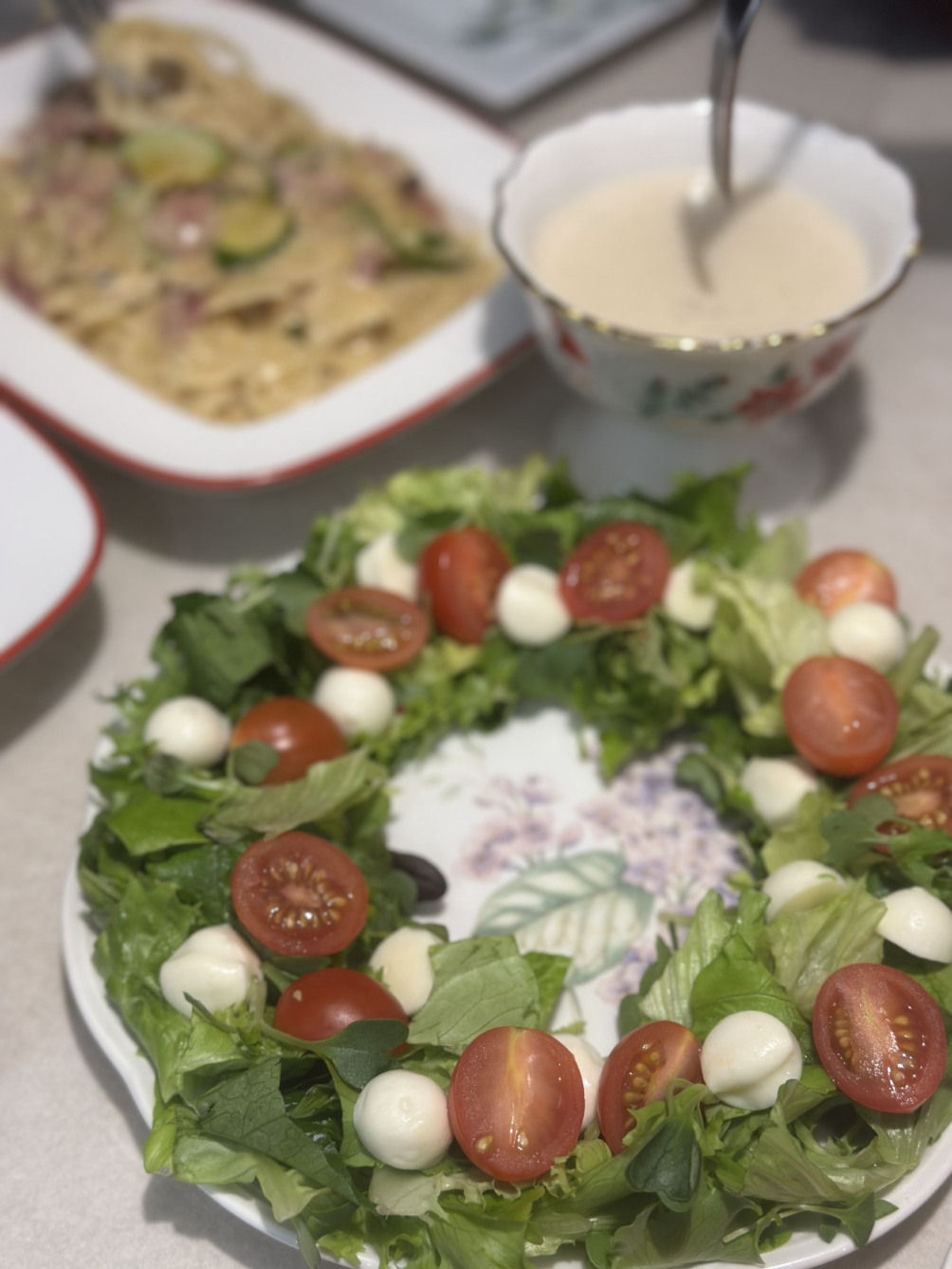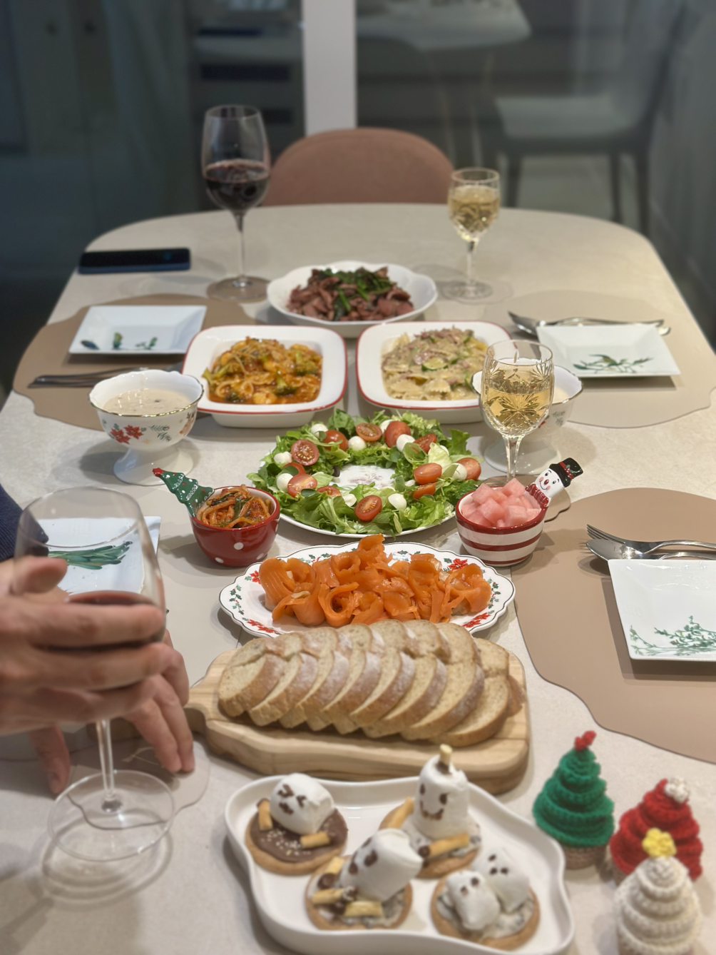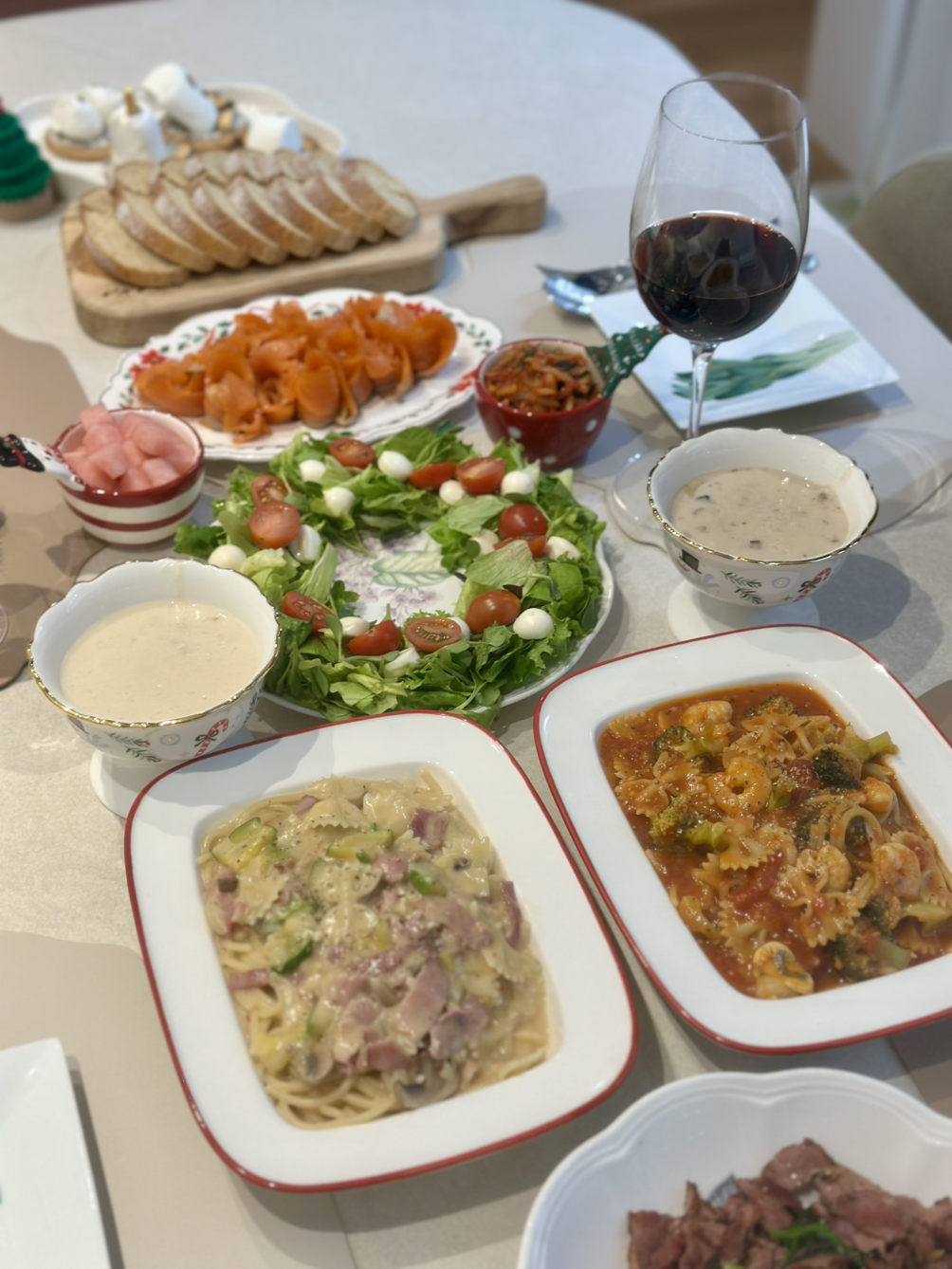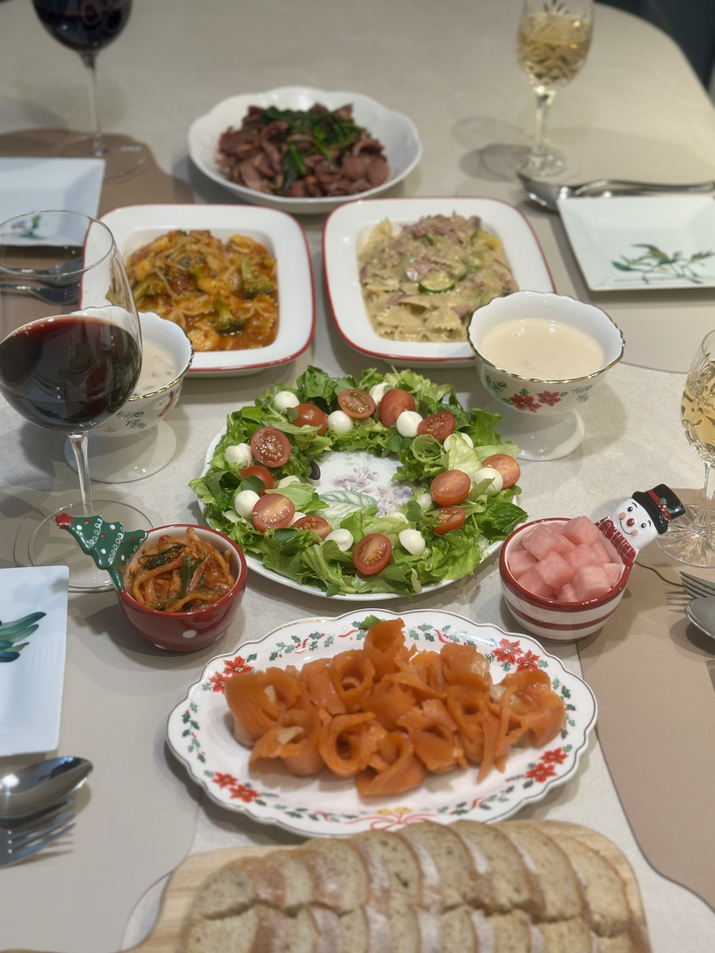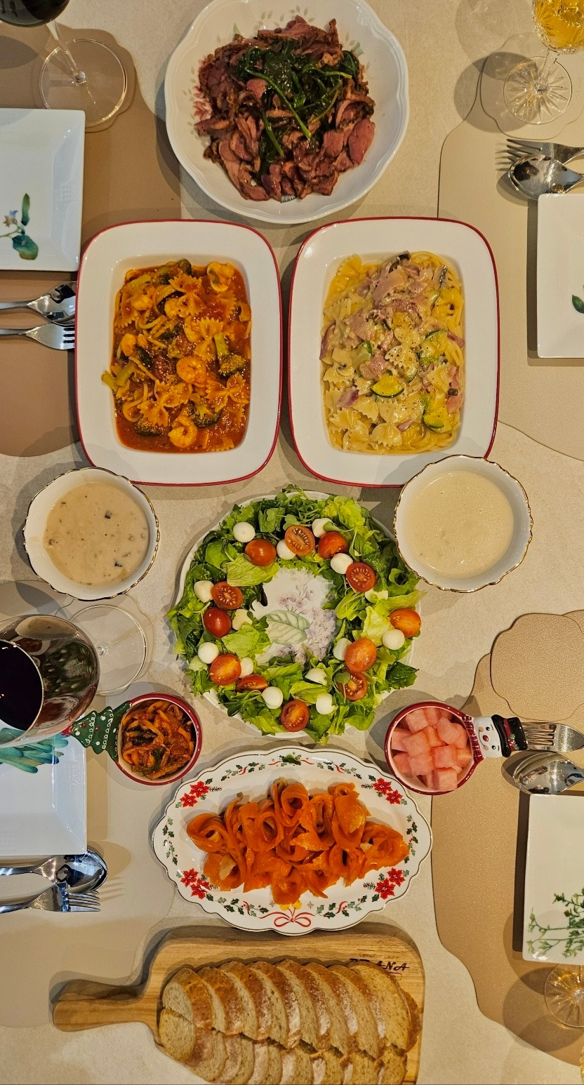어제는 크리스마스이브. 아무리 바빠도 온 가족 함께 모여 집에서 만찬을 즐기고 싶은 그런 날이었죠. 저는 재택근무를 하기 때문에 8시 반까지 서재에서 줌으로 수업을 하고 한창 파티 준비 중인 주방에 합류했습니다. 수업 사이사이에 장을 보고, 파스타 소스를 만들고, 샐러드 감을 손질해 놓고 퇴근한 신랑과 바통 터치. 요리 완성을 위해 신랑에게 몇 가지 미션을 주고 수업에 다녀온 참이었죠. 그에게 주어진 미션은 세 가지였습니다. 샐러드 크리스마스 리스 모양으로 세팅하기, 훈제 연어 접시에 덜어놓기 그리고 오리고기 시금치와 볶아놓기. 식탁 위를 살펴보니 메인 미션 외에 번외 미션으로 호밀빵 예쁘게 썰어 굽기와 수프 데워서 덜어놓기까지 완벽하게 마쳐놓은 상태였습니다. 브라보! 식세기 생활 19년 정도 되니 이제 요리 기능까지 탑재되었네요. “언제 이렇게 다 했어? 너무 예쁘게 잘했다~!” 폭풍 칭찬하며 분주히 파스타 면을 삶고 만찬 준비를 마무리합니다.