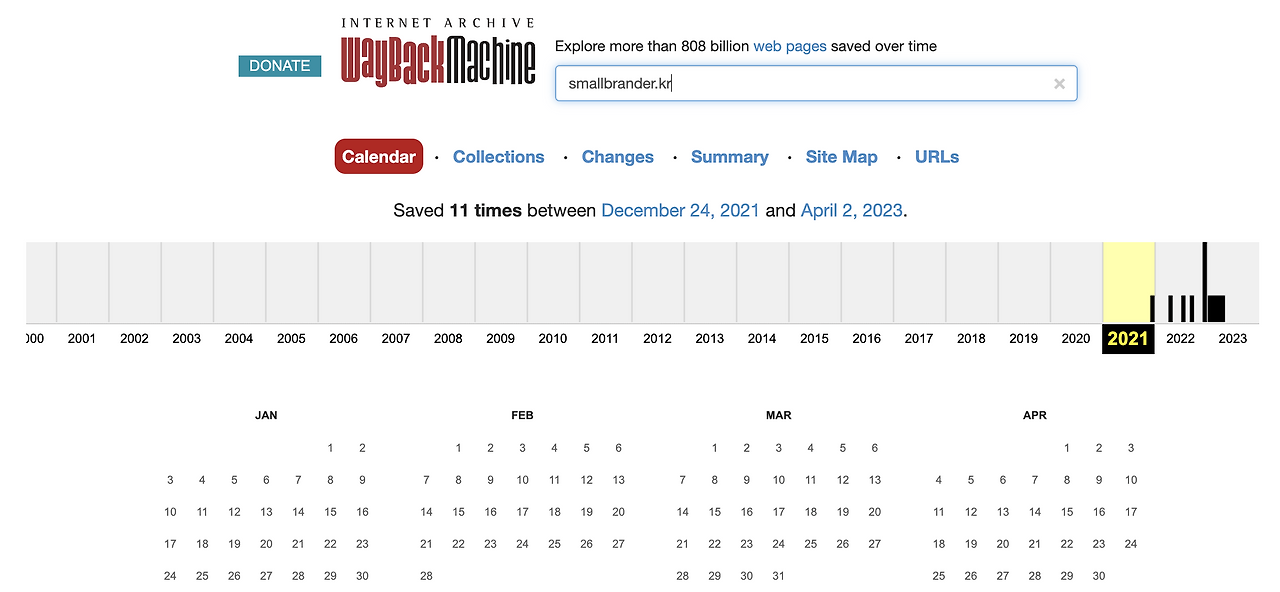 다른 웹사이트에서 좋은 레퍼런스를 발견해서 참고하고 싶은데, 다시 접속 했을 때 사이트가 업데이트 되어 발견하기 어려웠던 적 있나요? 마찬가지로 우리 브랜드의 사이트 또한 업데이트 이후에는 이전 버전을 찾아보기가 어려우실텐데요. 일명 디지털 캡슐, 웹 아카이브 서비스를 이용해서 손쉽게 찾아볼 수 있습니다. 특정 정보의 진위를 파악할 때나 이전 버전의 상세페이지 및 콘텐츠를 찾아야할 때도 유용하답니다.