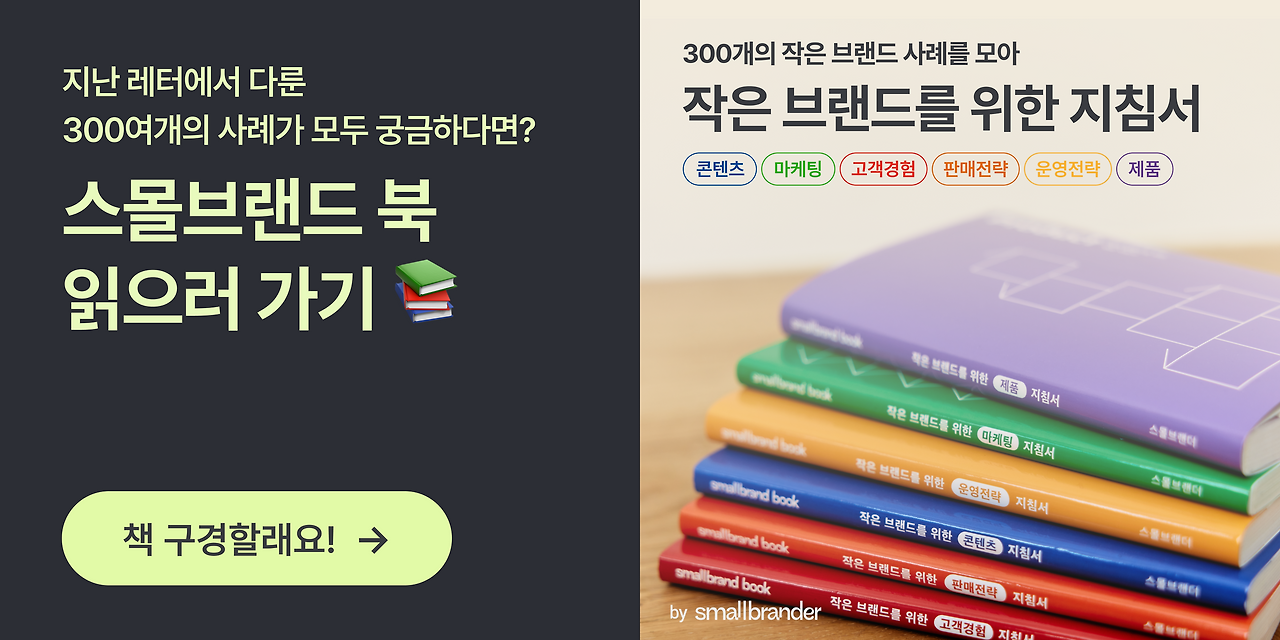 뉴스레터를 구독하시면, 더 풍성하고 유익한 이야기를 2주에 한 번 메일함으로 보내드립니다. 다양한 정보와 영감으로 스몰 브랜드를 준비하거나 운영하는 여러분들께 도움을 드리려고 합니다. 조금 느리더라도 확실한 팬을 만들고 싶은 브랜드라면, 스몰레터를 구독하고 성장에 도움이 되는 많은 정보를 받아보세요!