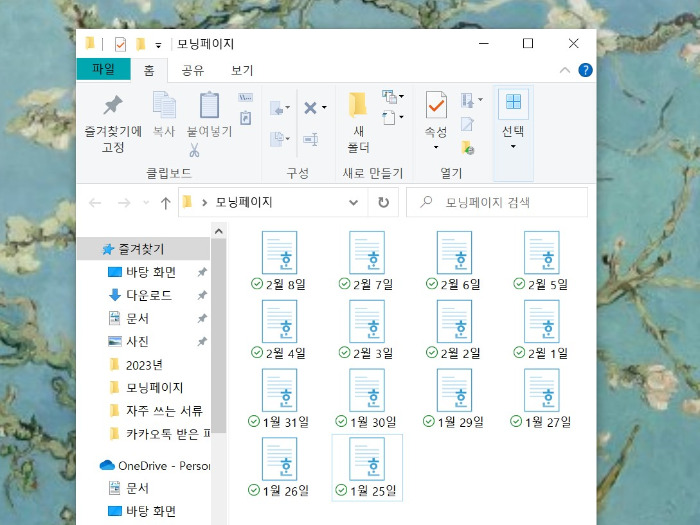 그렇게 2주 동안 매일 아침에 연필로 글을 쓰고 있다. 종이에 써놓은 외국말 같은 글씨를 해석 못할까 봐 바로 워드 파일에 옮겨놨더니, ‘모닝페이지’라는 이름의 폴더에 벌써 14개의 글이 생겼다. 당장 책으로 출간할 만큼 멋들어지기는커녕, 브런치에 올리려고 해도 여러 번 손봐야 할 정도로 엉망이지만 바라만 봐도 웃음이 났다.