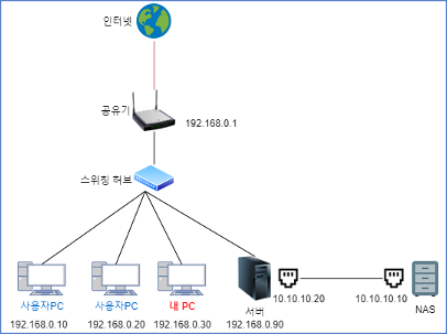 이 구성도는 조금 복잡한 구성을 가지고 있습니다. 물론 이보다 훨씬 복잡한 구성도 있지만 예시이기 때문에 다른 추가적인 장비 없이 구성된 비교적 간단(?)한 그림입니다.