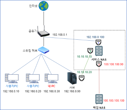 여기서 주의할 점은, NAS의 세 개의 IP가 대역이 다른 것을 볼 수 있습니다. (192.168.0.XXX / 10.10.10.XXX / 100.100.100.XXX)