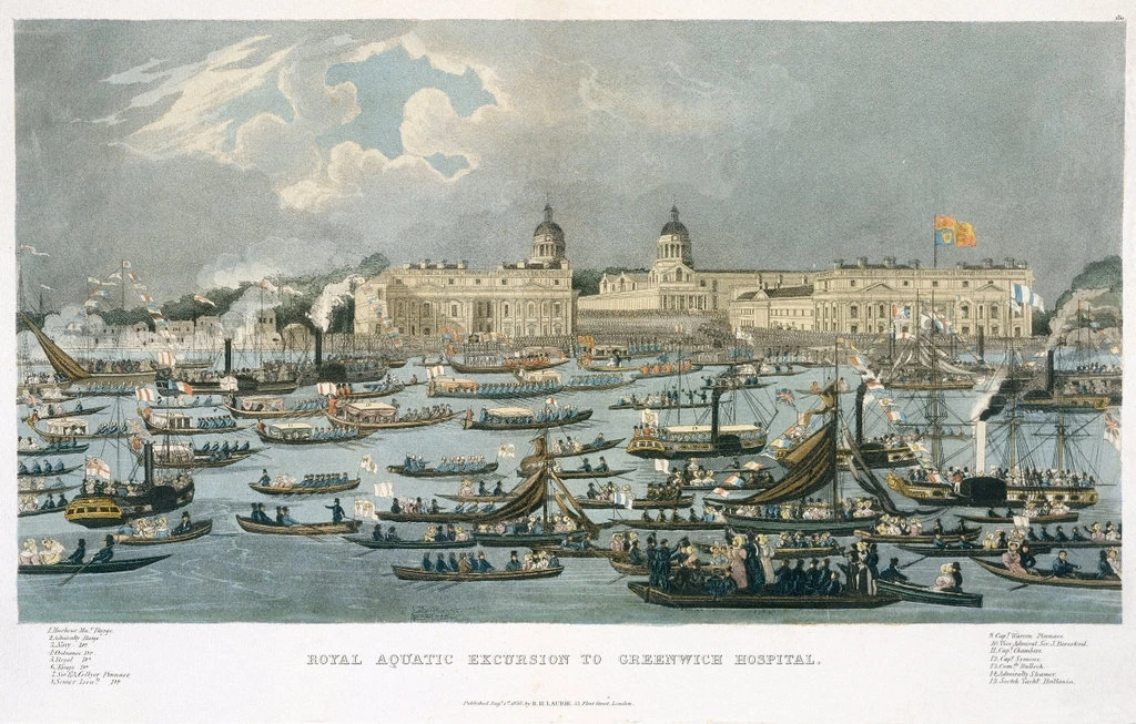 그림의 주요 대상이 되는 그리니치 병원은 전쟁에서 부상당하거나 나이 든 선원들을 영국이 돌봐야 한다는 신념으로 설립되었다. 병원이 설립되던 17세기에는 여러 해전이 있었는데, 전쟁에 참여했다가 부상을 당하고 돌아온 선원들 중 형편이 넉넉지 않은 경우, 살기 위해 구걸을 해야 하는 경우가 흔했다. 1692년 5월 영국 해군이 <라 호그 전투>에서 프랑스군을 상대로 대승을 거뒀다는 소식이 전해졌고, 이 전투에서 부상당한 선원들에게 감명받은 메리 여왕은 해군 기지가 있는 포츠머스로 외과의사를 보내 그들을 치료하는 등 이들의 처우와 복지에 관심이 많았다. 메리 여왕은 재무부에 그리니치 병원 설립 허가 해달라는 의견을 전달하는 등 열정을 보이기도 했는데, 불행히도 그녀는 1694년 12월 천연두로 갑작스러운 죽음을 맞이하면서 병원이 설립되는 걸 보지는 못했다. 당시 왕이자 남편이었던 윌리엄 3세는 여왕만큼 그리니치 병원 설립에 대한 열의는 없었다고 한다. 하지만 여왕의 갑작스러운 죽음 후에 그녀가 꿈꿨던 생전의 바람을 실현하기 위해 병원 설립에 대한 왕실 헌장(일종의 허가증)을 발급했고, 헌장에 여왕의 이름이 포함될 수 있도록 그녀가 살아있던 시기로 문서를 작성해 그녀의 유지를 이어 나갔다. 병원의 설립 헌장에는 다음과 같은 내용이 명시되어 있다.