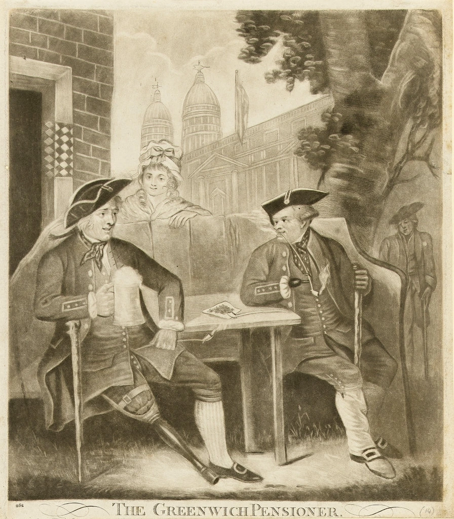 그리니치 병원은 현대의 병원보다는 요양원, 양로원의 모습에 가까웠다. 그래서 그리니치 병원에서 생활하는 참전 군인들은 환자가 아닌 그리니치 연금 수급자(Greenwich Pensioner)로 불렸다. 이들에게는 선원들처럼 제복과, 모자가 지급되었기 때문에 그리니치에서는 위 그림에 묘사된 복장의 사람들을 자주 볼 수 있었다. 이들을 묘사한 그림에는 항상 지팡이, 의족, 의수, 제복, 삼각형 모자, 파이프 담배가 빠지지 않고 등장하다.
