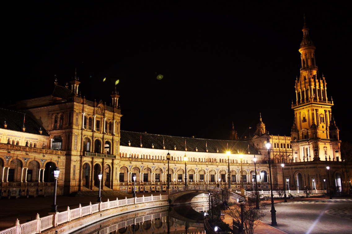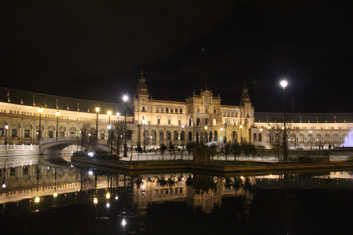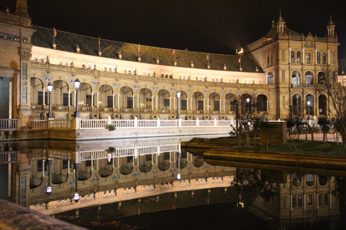 플라멩고를 본 후 열기와 들뜬 마음을 안고 다시 스페인 광장으로 향한다. 광장에 들어선 순간 심장이 덜컥 내려앉는 것을 느낀다. 그리고 알았다. 바로 이것을 보기 위해 세비야에 왔음을. '보석같다' 는 생각이 들었다. 가장 빛나고 특별한 보석. 새까만 밤하늘 밑에서 그 보석은 더욱 금빛으로 환하게 빛난다. 고요한 물이 거울처럼 그 보석을 비춘다. 낮의 활기, 밝음과 완전히 상반된 정적인 아름다움이 지배하는 밤의 스페인 광장은 마치 낮과는 다른 공간처럼 느껴진다.