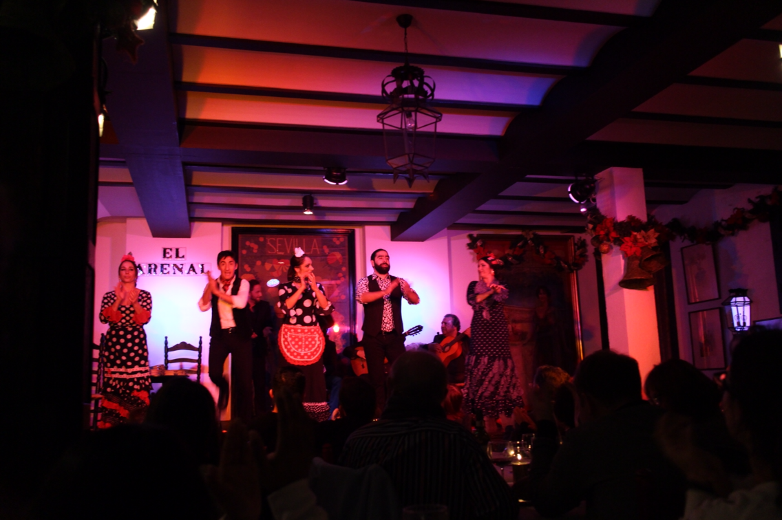 스페인 광장에서 한참 사진찍기 놀이를 하다가 나와서 가까운 스타벅스에도 가고 투우 경기장에도 갔다. 과달키비르 강가에서 노을 구경도 했다. 근처 버거킹에 가서 저녁을 먹은 후 플라멩고를 보러 엘 아르날에 갔다. 꽃보다 할배에 나온 바로 그 집이다. 가격은 음료 포함 38유로로 20유로인 플라멩고 박물관에 비해 꽤 비싸다. 세비야가 플라멩고의 본고장이므로 꼭 플라멩고를 봐야 한다고 들어서 비싸지만 간다. 7시 반, 공연이 시작됐다. 손가락을 딱딱거리는 소리가 들려왔고 엄청난 카리스마를 뿜으며 댄서가 등장한다. 절제된 동작, 카리스마 넘치는 눈빛, 간단한 몇 개의 동작으로 모든 것을 전달한다. 뒤에는 기타를 치는 분과 노래를 하는 분이 있다. 노래와 춤이 점점 격해진다. 노래에는 뭔지 모를 한이 서린 듯하고 춤은 동작이 커지고 역동적으로 바뀐다. 탭댄스를 연상시키는 현란한 발동작과 캐스터네츠 소리 같은 맑은 구두 마찰음이 인상적이다. 여자 댄서는 나이는 좀 있지만 얼굴이 아주 작고 검은 머리와 검은 눈이 신비로운 느낌을 준다. 강한 눈빛과 절제되고 힘찬 동작에서 뿜어내는 카리스마와 에너지가 엄청나다. 남자 댄서는 꽃보다 할배에 나온 마른 체격에 키가 크고 나이가 좀 있는 그 분이다. 정말 열심히 땀흘리며 하시는데 동작이 힘차면서도 웬지 슬퍼보인다. 다른 댄서 분들도 다 수준급인 것 같았고 특히 왼쪽에서 네 번째 수염 기른 분은 체격이 있어서인지 구두로 내는 소리도 힘차고 역동적이었다.