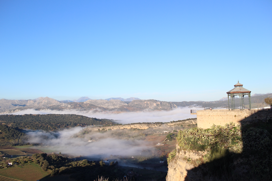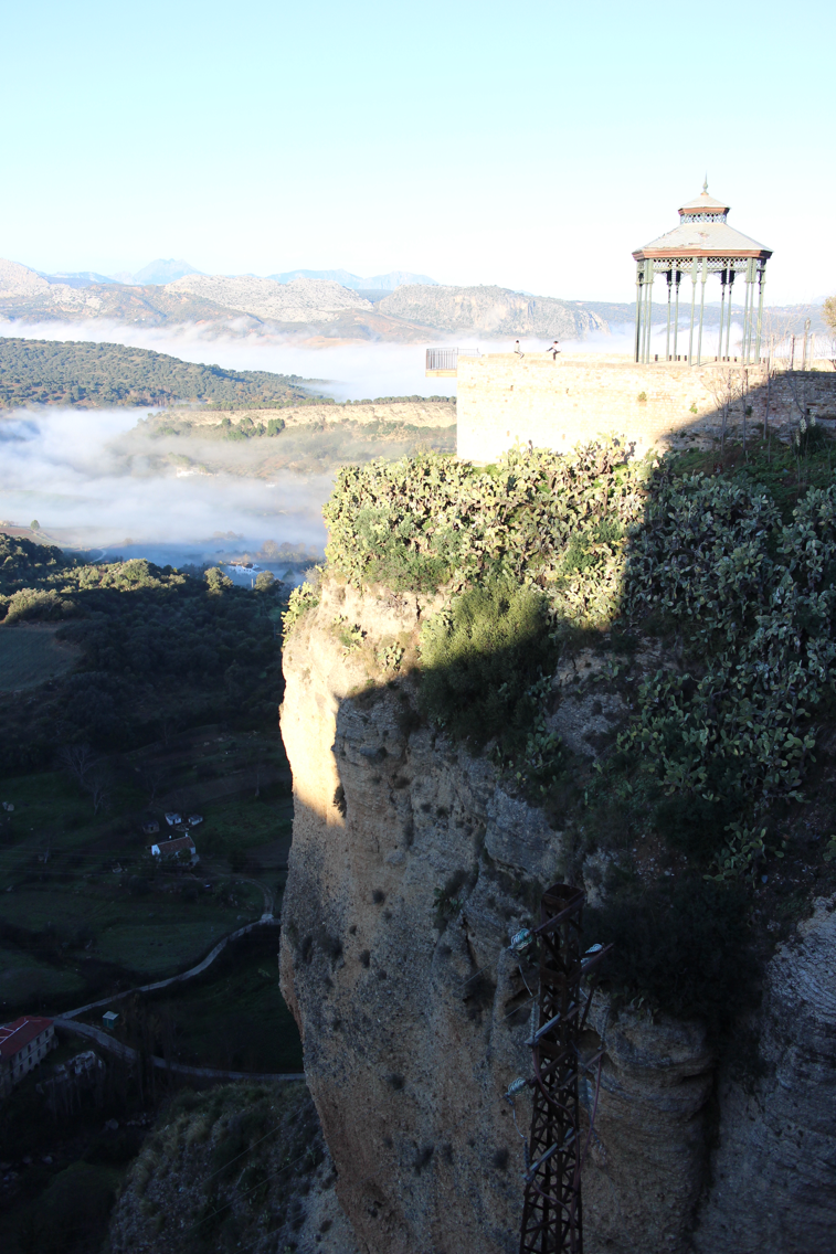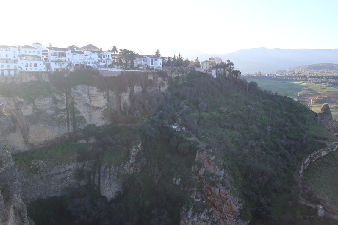 다음날 아침 눈을 뜨자마자 창을 열어보니 이런 풍경이 펼쳐져 있다. 햇빛을 받은 누에보 다리와 절벽은 간밤과는 전혀 다른 분위기이다. 다리 옆으로 난 길을 따라 걸어가 보니 절벽을 더 멀리서 조망할 수 있었다. 이른 아침이라 안개가 낀 모습을 볼 수 있었다. 고요한 아침의 분위기에 젖어 생각에 잠기려는데 들려오는 친숙한 한국말. 미리 와서 사진을 찍는 일행도 한국인이고 내 뒤쪽에서 따라오던 남자 두 명도 한국인이다. 스페인에는 한국 사람이 정말 많다. 론다 역시 꽃보다 할배에 나온 곳이라 한국인 천지다. 알록달록한 등산복을 입고 누에보 다리를 활보하는 중년 패키지 관광객들을 흔하게 볼 수 있다. 그런데 대부분은 20분도 안되서 어디론가 사라진다. 한국인이 많은 지역을 관광하는 것에는 장점과 단점이 있다. 장점은 길을 못 찾을 때 물어볼 수 있고 혼자 가도 동행을 구하기 쉽다는 것. 단점은 먼 이국에 온 기분을 느끼기 힘들고 조용하게 생각에 잠기기도 힘들다는 것. 다음에는 꽃보다 할배에 나오지 않은 지역만 골라서 관광해보는 것도 재미있을 듯.