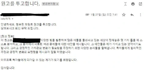 공개하기는 그렇지만 1차 투고한 메일과는 다르게 제목부터 어디 출판사의 누구에게 보내는 어떤 메일인지를 명확히 했고, 메일 내용에도 기획서에 기재된 내용을 활용하여 수신인이 원고의 개요를 파악할 수 있도록 작성했다.