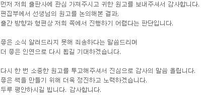 나의 첫 번째 투고 메일은 이랬고, 당연히 20여 군데 투고한 내 원고에 대해 관심을 갖는 곳은 단 한 군데도 없었다. 나는 정말로 아무것도 몰랐다. 그리고 제대로 준비도 하지 않았다. 얼마 뒤, 내 메일함에는 이런 메일이 도착해 있었다.