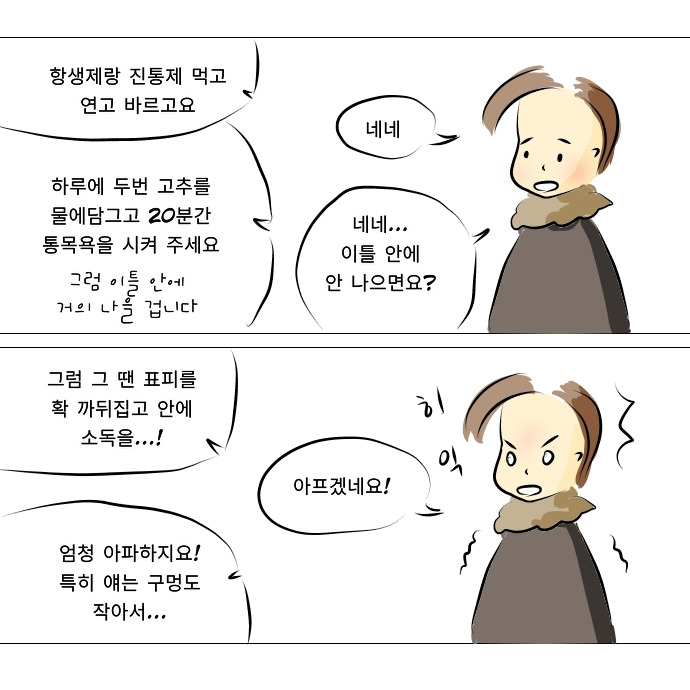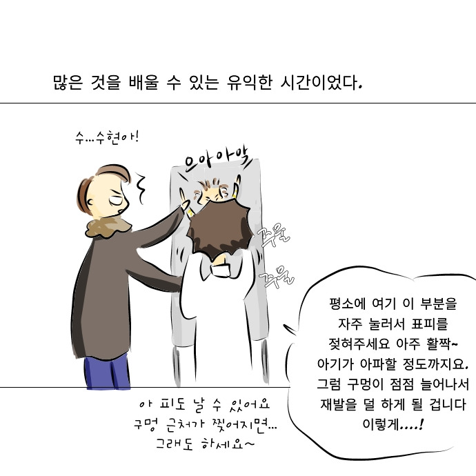 치료방법은요? 항생제와 항생제 연고로 간단하게 치료 가능합니다 (이틀 정도 소요) 이 안에 치료가 되지 않을 경우 표피를 뒤집고 잠깐 안을 소독할 수 있음<- 아기가 많이 아파함 (당연)