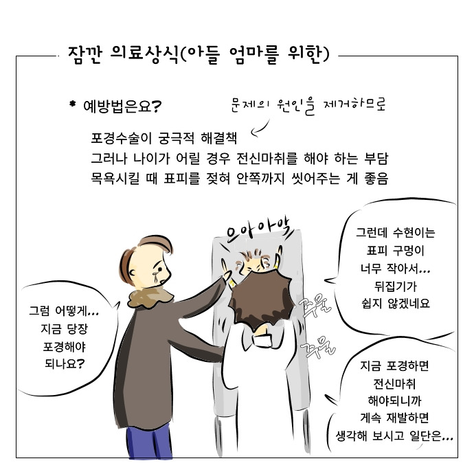 예방법은요? 포경수술이 궁극적 해결책 그러나 나이가 어릴 경우 전신마취를 해야 하는 부담 목욕시킬 때 표피를 젖혀 안쪽까지 씻어주는 게 좋음
