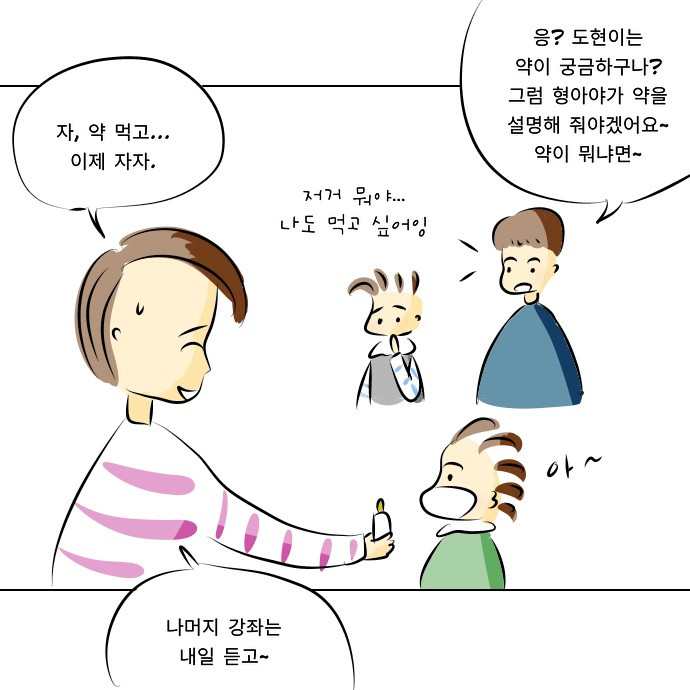 책을 좋아하는 아이에게 와이과학책 전집을 사주면 생기는 현상인데, 잡지식이 어마어마하게 늘어납니다. 평소에는 엄마 아빠한테 지식을 자랑하는 재미로 사는데(자기가 낸 문제를 못 맞추기라도 하는 날이면 잘난척이 말도 못함) 엄마가 바빠서 상대를 안 해주면 동생들을 붙잡고 강의를 합니다... 물론 수현이는 들어주지 않지요. 그나마 형아바라기 도현이가 옆을 맴돌아주기 때문에 늘상 형아의 강의 대상은 도현이입니다.