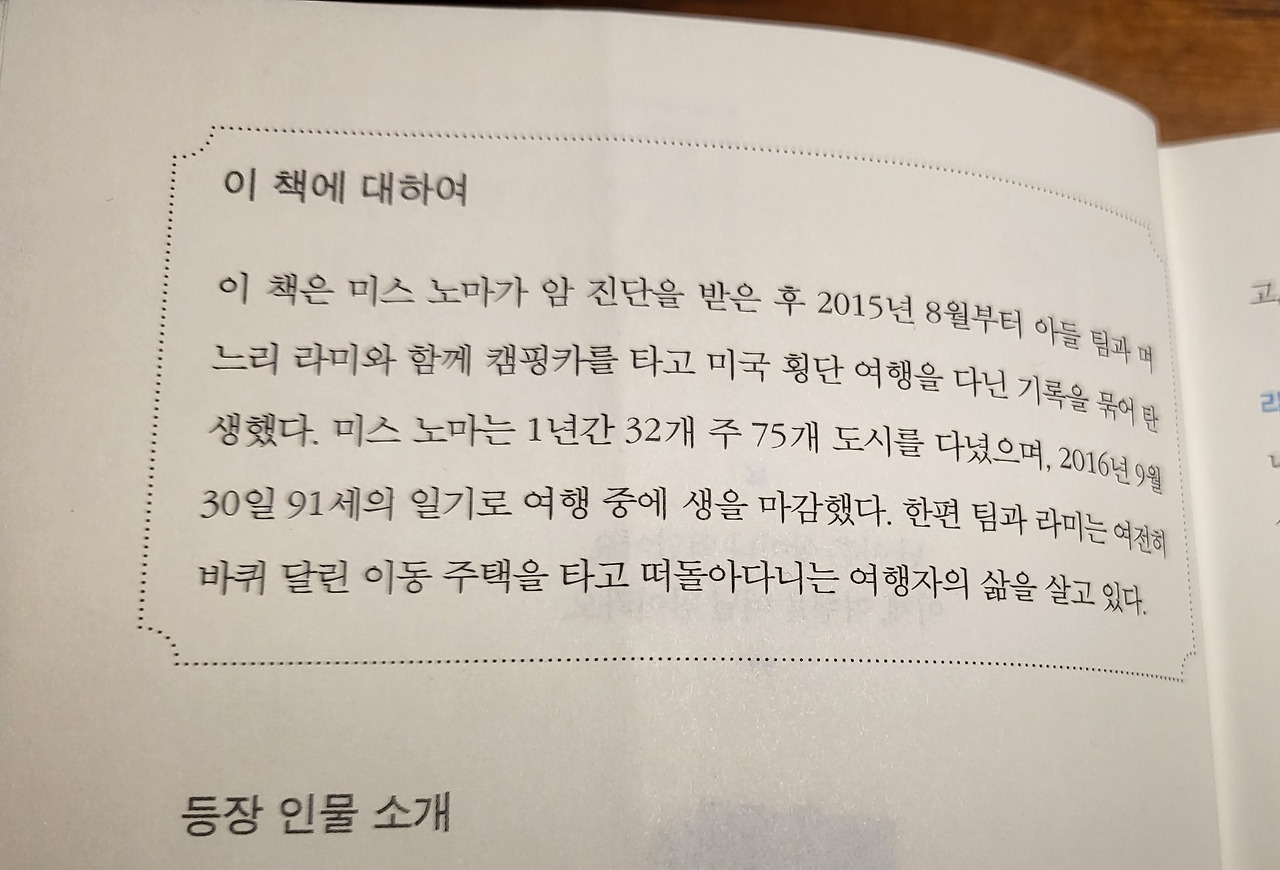이 책은 미스 노마가 암 진단을 받은 후 2015년 8월부터 아들 팀과 며느리 라미와 함께 캠핑카를 타고 미국 횡단 여행을 다닌 기록을 묶어 탄생했다. 미스 노마는 1년간 32개 주 75개 도시를 다녔으며, 2016년 9월 30일 91세의 일기로 여행 중에 생을 마감했다. 한편 팀과 라미는 여전히 바퀴 달린 이동 주택을 타고 떠돌아다니는 여행자의 삶을 살고 있다.