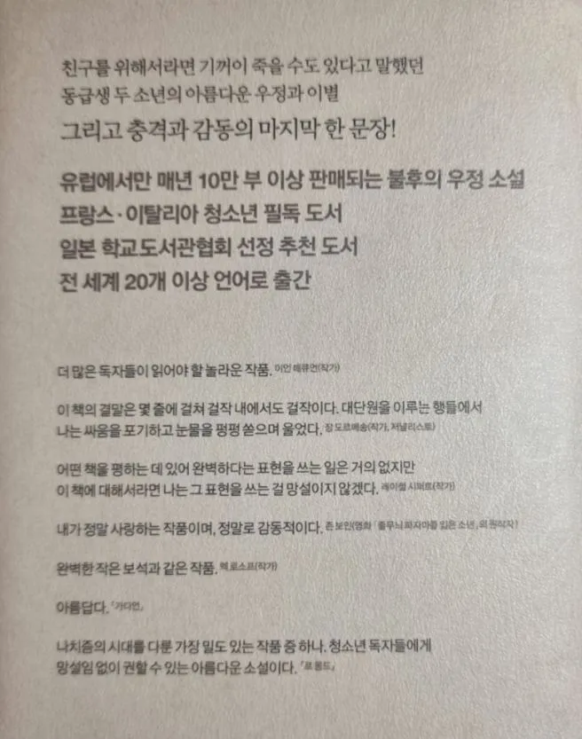 그는 다시는 나를 자기 집으로 부르지 않았고 나는 그에게 그런 꾀바름이 있다는 게 고마웠다. 우리는 전에 그랬던 대로 아무 일도 없었던 것처럼 만났고 그도 우리 어머니를 보러 왔지만 차츰차츰 횟수가 줄어들었다. 상황이 다시 전과 같아지지 않을 것이며 우리의 우정과 어린 시절의 종말이 다가오고 있다는 것을 우리 둘 모두 알고 있었다.122쪽.