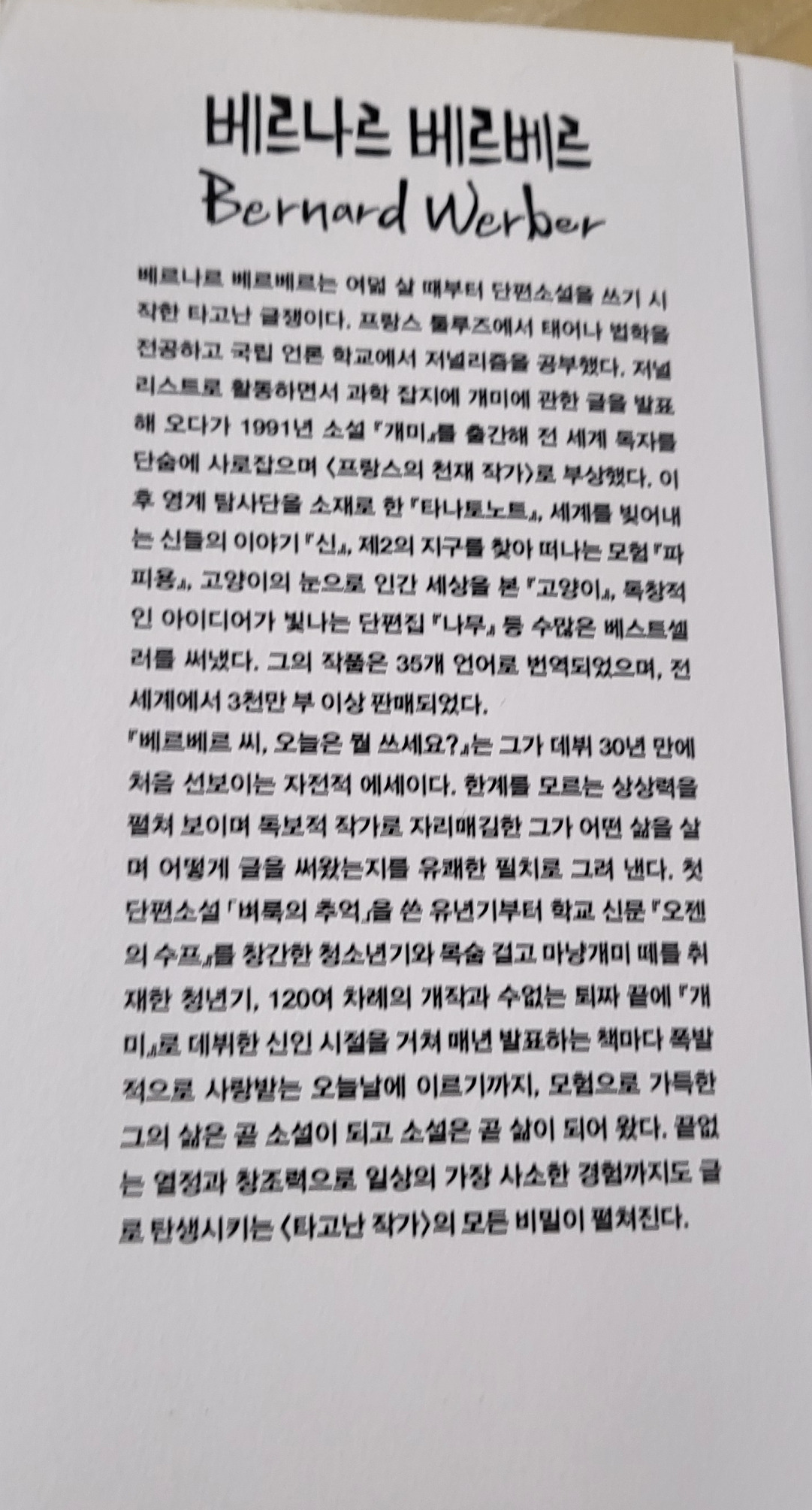 이번 책의 원제는 <개미의 회고록>이다. 『개미』의 작가로 대중에게 인식되는 작가가 개미처럼 써온 지난 30년을 돌아보며 뒤늦게 기록한 일기처럼 읽힌다. <일기>라는 표현을 쓴 것은 그만큼 작가의 숨김없는 자기 고백이 담겨 있기 때문이다. 동시에 이 책은 성공한 작가 베르베르가 초보 작가들에게 건네는 글쓰기 안내서이기도 하다. 작가는 책에서 『개미』를 쓸 때 누군가 옆에서 조언해 주는 사람이 있었더라면 시간을 많이 절약할 수 있었으리라고 아쉬움을 토로한다. 글쓰기에 열정을 느끼는 독자라면 이 책에서 멘토 베르베르를 만날 수 있을 것이다. 475쪽.