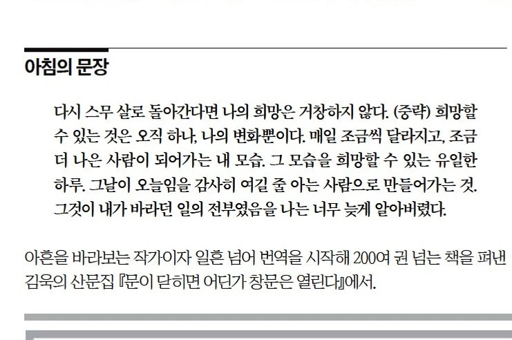 다시 스무 살로 돌아간다면 나의 희망은 거창하지 않다. (중략) 희망할 수 있는 것은 오직 하나, 나의 변화뿐이다. 매일 조금씩 달라지고, 조금 더 나은 사람이 되어가는 내 모습. 그 모습을 희망할 수 있는 유일한 하루. 그날이 오늘임을 감사히 여길 줄 아는 사람으로 만들어가는 것. 그것이 내가 바라던 일의 전부였음을 나는 너무 늦게 알아버렸다.