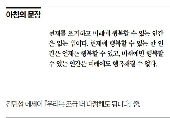 현재를 포기하고 미래에 행복할 수 있는 인간은 없는 법이다. 현재에 행복할 수 있는 한 인간은 언제든 행복할 수 있고, 미래에만 행복할 수 있는 인간은 미래에도 행복해질 수 없다.