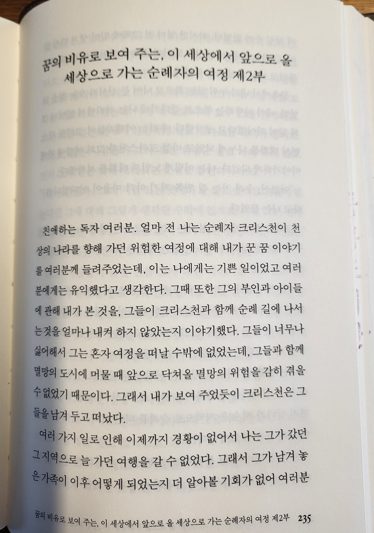 여러 가지 일로 인해 이제까지 경황이 없어서 나는 그가 갔던 그 지역으로 늘 가던 여행을 갈 수 없었다. 그래서 그가 남겨 놓은 가족이 이후 어떻게 되었는지 더 알아볼 기회가 없어 여러분에게 알릴 수가 없었다. 하지만 얼마 전 그쪽에 일이 생겨 다시 갔다. 그 장소에서 1마일 정도 떨어진 숲속에 거처를 정한 뒤 잠이 들었고 나는 다시 꿈을 꾸었다. 꿈 속에서 내가 누워 있는 쪽으로 나이 든 신사가 오는 것을 보았다. 내가 여행하는 쪽으로 간다기에 나는 자리에서 일어나 그와 같이 가야겠다고 생각했다. 우리는 여행자들이 그러듯 걸으면서 대화를 나누게 되었고 마침 크리스천과 그의 여행에 관해 이야기하게 되었다. 나는 이렇게 노인과 대화를 시작했다. 235쪽.
