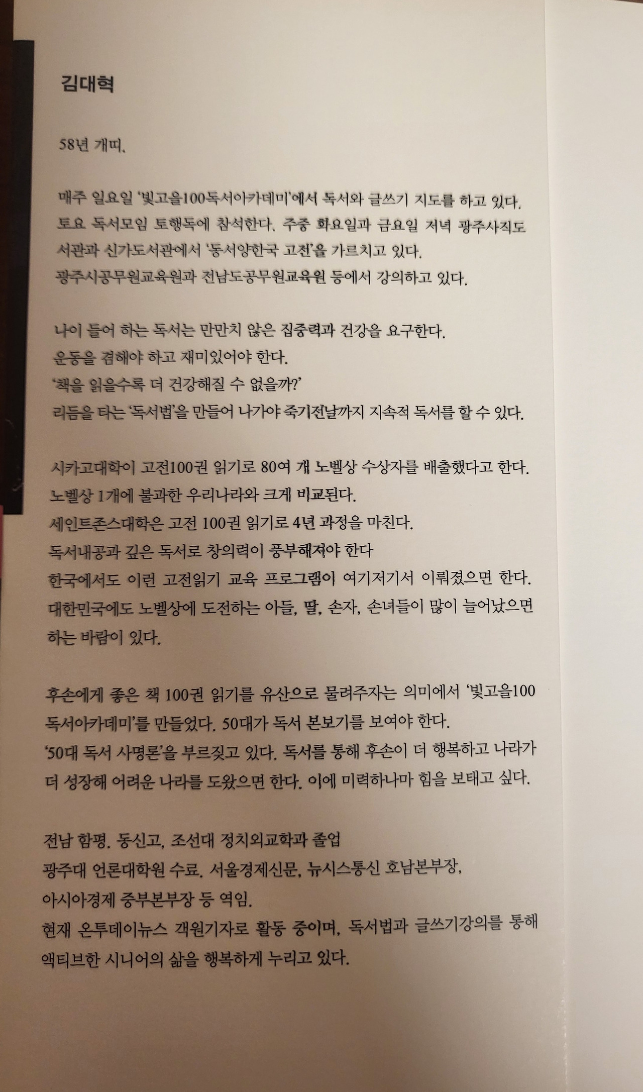 독서에 관한 책들을 찾다가 우연히 『액티브 시니어의 깊이 있는 독서법』이란 책을 만났다. 저자는 지방도시에서 약 십 년 전부터 매주 한 권씩 책을 읽으며 독서 모임에 참석하다가 독서모임을 만들어 진행하고 독서법과 글쓰기 강의를 하는 독서의 고수가 되었다. 본인이 십여 년 동안 배우고 실천하고 가르치면서 깨닫게 된 ' 본. 깨. 적' 독서법- 본다, 깨닫는다, 적용한다 는 독서법을 전파하는 독서법 전도사가 되었다. 본인의 경험과 깨달음과 적용으로 얻게 된 내용들이라 이론적이고 추상적인 것이 아니라 실천 가능한 실용적인 독서법을 만난 것 같아 기쁘고 감사했다.