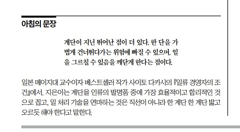 일본 메이지대 교수이자 베스트셀러 작가 사이토 다카시의 『일류 경영자의 조건』에서. 지은이는 계단을 인류의 발명품 중에 가장 효율적이고 합리적인 것으로 꼽고, 일 처리 기술을 연마하는 것은 직선이 아니라 한 계단 한 계단 밟고 오르듯 해야 한다고 말한다.