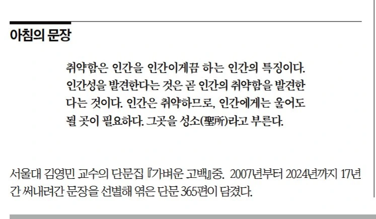 서울대 김영민 교수의 단문집 『가벼운 고백』중. 2007년부터 2024년까지 17년간 써 내려간 문장을 선별해 엮은 단문 365편이 담겼다.