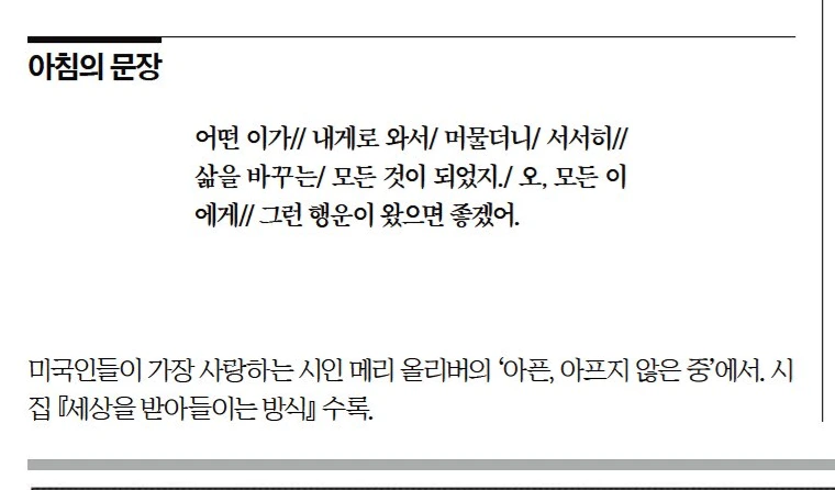 미국인들이 가장 사랑하는 시인 메리 올리버의 ‘아픈, 아프지 않은 중’에서. 시집 『세상을 받아들이는 방식』 수록.