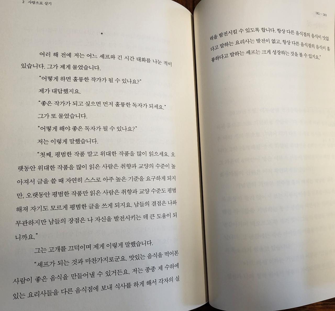 “셰프가 되는 것과 마찬가지로군요. 맛있는 음식을 먹어 본 사람이 좋은 음식을 만들어 낼 수 있거든요, 저는 종종 제 수하에 있는 요리사들을 다른 음식점에 보내 식사를 하게 해서 각자의 실력을 발전시킬 수 있도록 합니다. 항상 다른 음식점의 음식이 맛없다고 말하는 요리사는 발전이 없고, 항상 다른 음식점의 음식이 훌륭하다고 말하는 셰프는 크게 성장하는 것을 볼 수 있지요.” 282-283쪽.