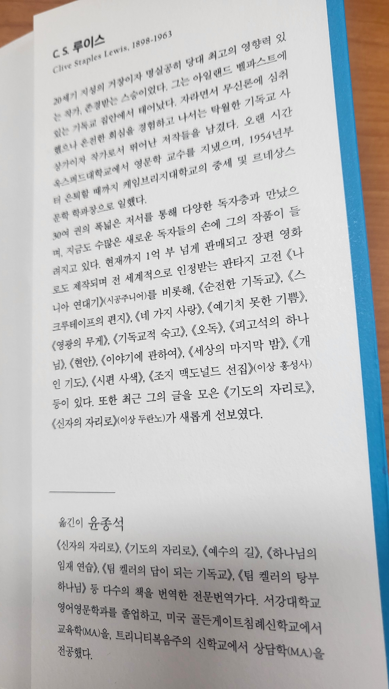 C.S. 루이스를 <나니아 연대기>의 작가로 보았을 때는 판타지적 성격이 강한 상상력이 풍부한 작가라고 생각하였다. 그렇지만 이 책을 읽으면서 C.S. 루이스가 옥스퍼드대학교 영문학 교수였으며 케임브리지 대학에서 중세 및 르네상스 문학 학과장으로 은퇴하였다는 것을 떠올리며 가르치는 데도 빈틈없이 탁월한 교수였다는 생각이 들었다.
