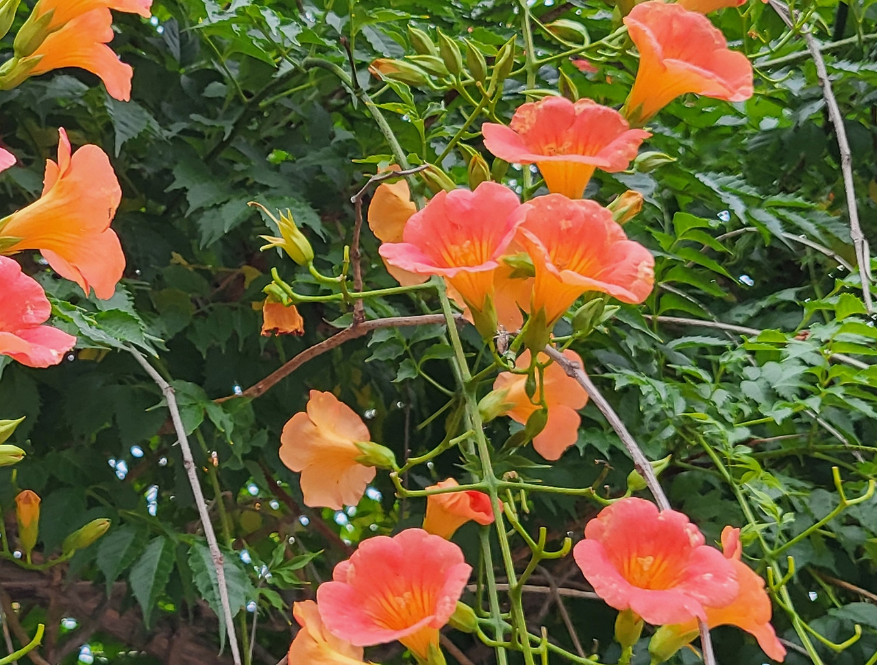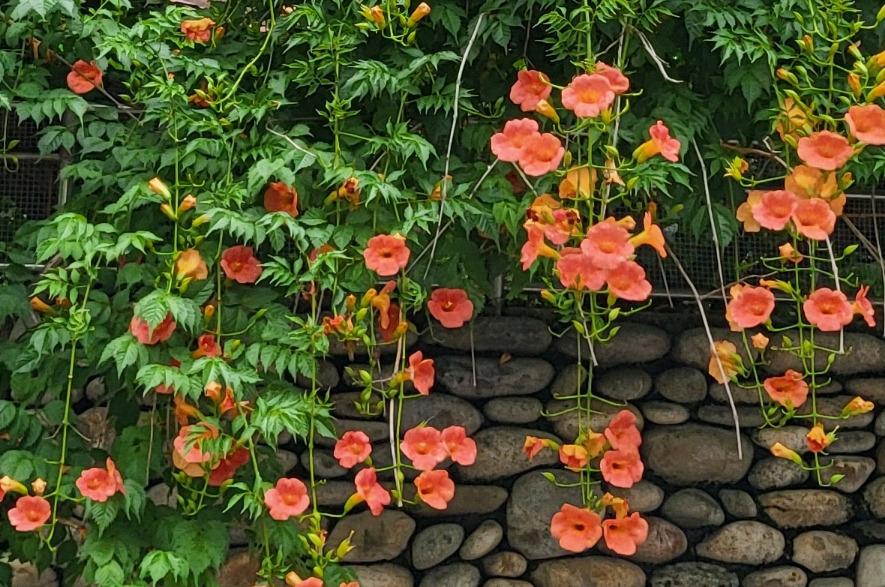 능소화는 대부분 그럴듯한 집 벽돌 굴뚝을 타고 오르거나 기와 담장 위로 기어 올라간다. 가장 기억에 남는 능소화는 강릉 오죽헌 담장에 기어오르던 능소화였다. 그때는 무슨 꽃인 줄도 몰랐지만 호젓한 대갓집 담장을 넘어 흐드러진 꽃이 꽤나 인상적이었다.