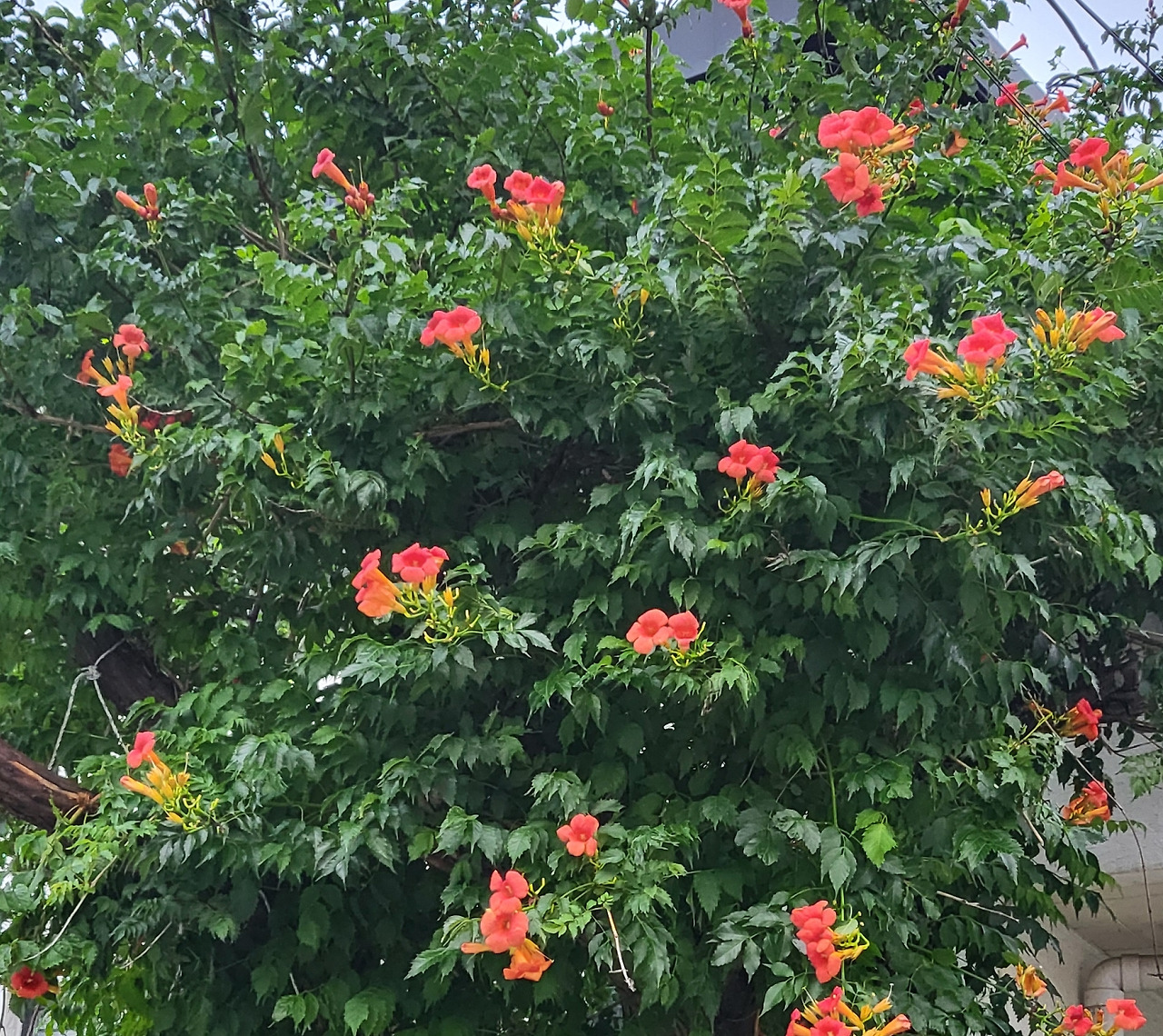능소화를 보면 아름다운데 도발적이라는 생각이 드는 것은 왜일까? 꽃 색깔이 흔하지 않은 주홍색이나 진홍색이기 때문일까. 혼자 자립하지 않고 큰 나무나 담장이나 굴뚝 등을 휘감아 가는 것이 위협적일 만큼 왕성하기 때문일까. 꽃가루가 사람에게 해롭다는 속설 때문에 생긴 선입견일까.