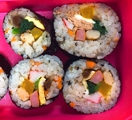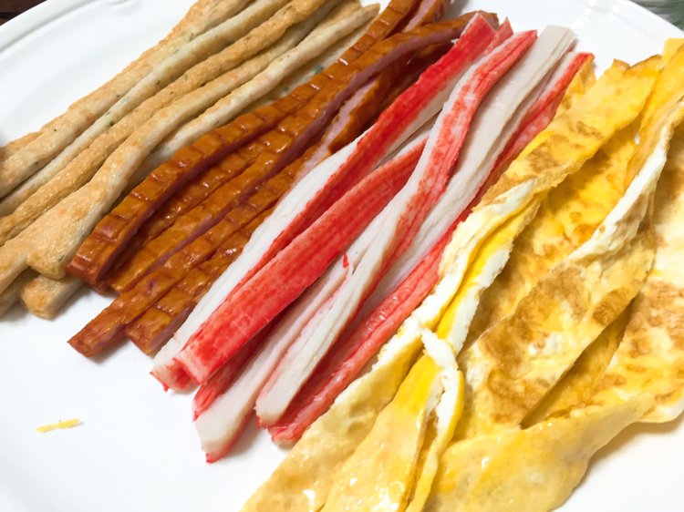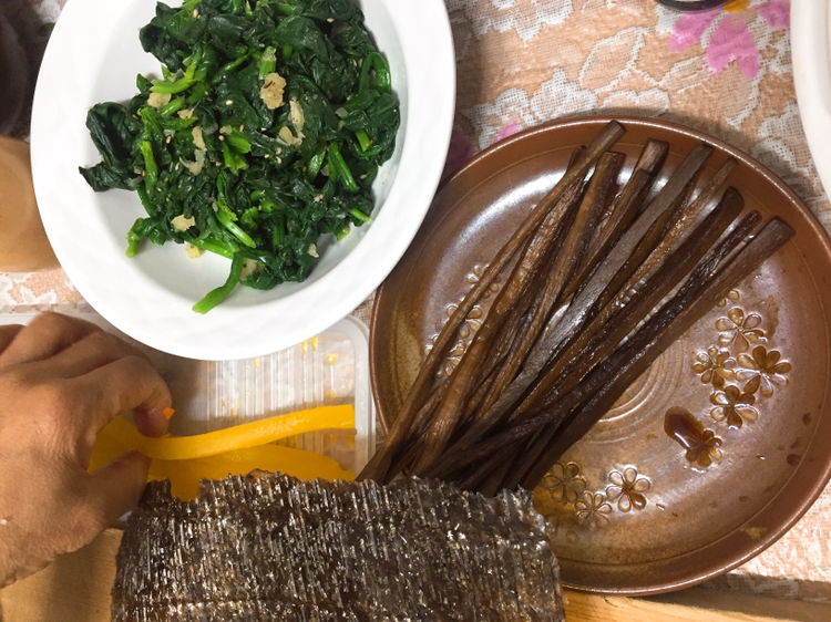 기다랗고 노란 단무지, 오동통한 맛살, 뜯기 좋게 선이 그어있는 불고기 맛 햄과 어묵, 제주산 흙당근, 시금치를 샀다.