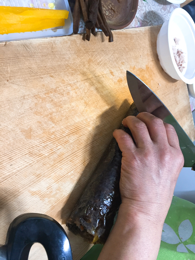 김은 동생 회사의 직장 동료가 선물로 준 좋은 놈을 쓰기로 해서 사지 않고, 색다르게 집에 있는 참치도 기름을 짜서 담백한 참치살만 넣은 참치 김밥도 몇 개 만들기로 했다.
