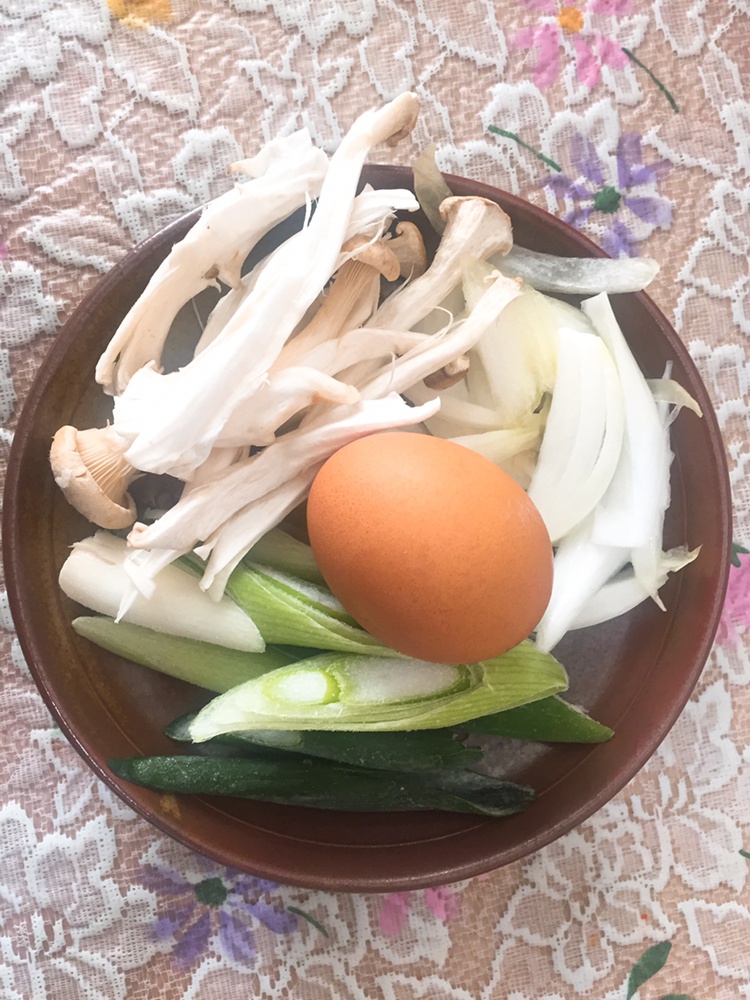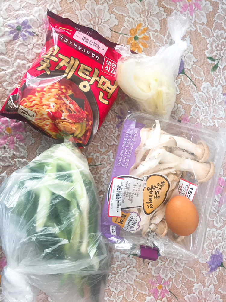 #재료: 라면 1개(나는 풀무원 꽃게탕면), 파, 다진마늘, 양파, 버섯, 계란