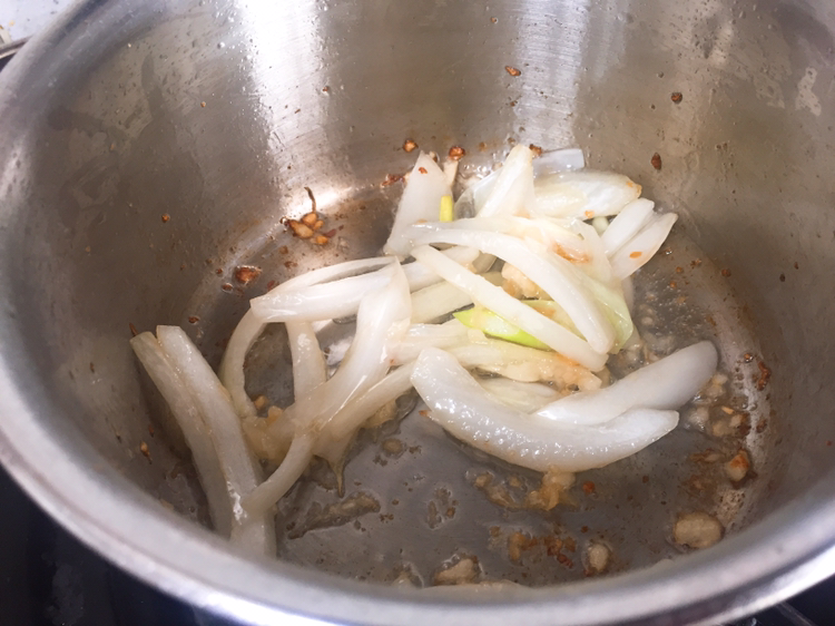 3. 어느 정도 기름에 코팅되듯 야채가 익고나면, 물 550ML를 붓고 끓인다.