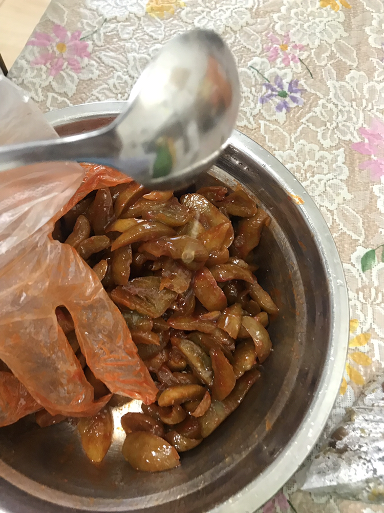 *재료: 매실, 액기스(숙성된 매실이 잠겨있던 국물?), 고추장 두 스푼, 고춧가루 한 스푼, 참기름, 깨소금, 다진 마늘 또는 마늘 액기스, 꿀 반 스푼(설탕대신 넣거나 아예 안넣어도 괜츈)