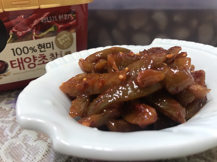 2. 고추장과 다진 마늘(혹은 액기스)를 넣고 간이 들도록 조물거린다. 집에 마늘 장아찌를 담궈둔 액기스가 있어서 다진 마늘 약간과 장아찌 국물, 꿀 조금을 넣었다. 다진 마늘 중 너무 큰 조각이 굴러다니면 먹기가;;;