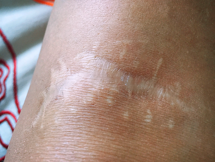 몹시 놀라고 진저리가 나는 고통을 왜 데였다고 할까 싶었는데, 문득 3년 전 사고로 다친 왼쪽 무릎 아래의 상처로 눈이 간다. 무대에서 떨어지는 사고로 왼쪽 무릎 바로 아랫 부분에 깊은 상처를 입었고 10센치 가량 봉합하는 수술을 하고 한달 넘게 깁스를 하게 되었다. 다친 직후에는 물론이고 회복되는 동안에도 무지막지한 통증으로 진통소염제와 마약성 진통완화 패치 등등 다양한 치료를 했는데, 육안으로 상처가 아문 이후에도 통증은 계속되었고 의사의 최종 진단은 '작열통'이었다.