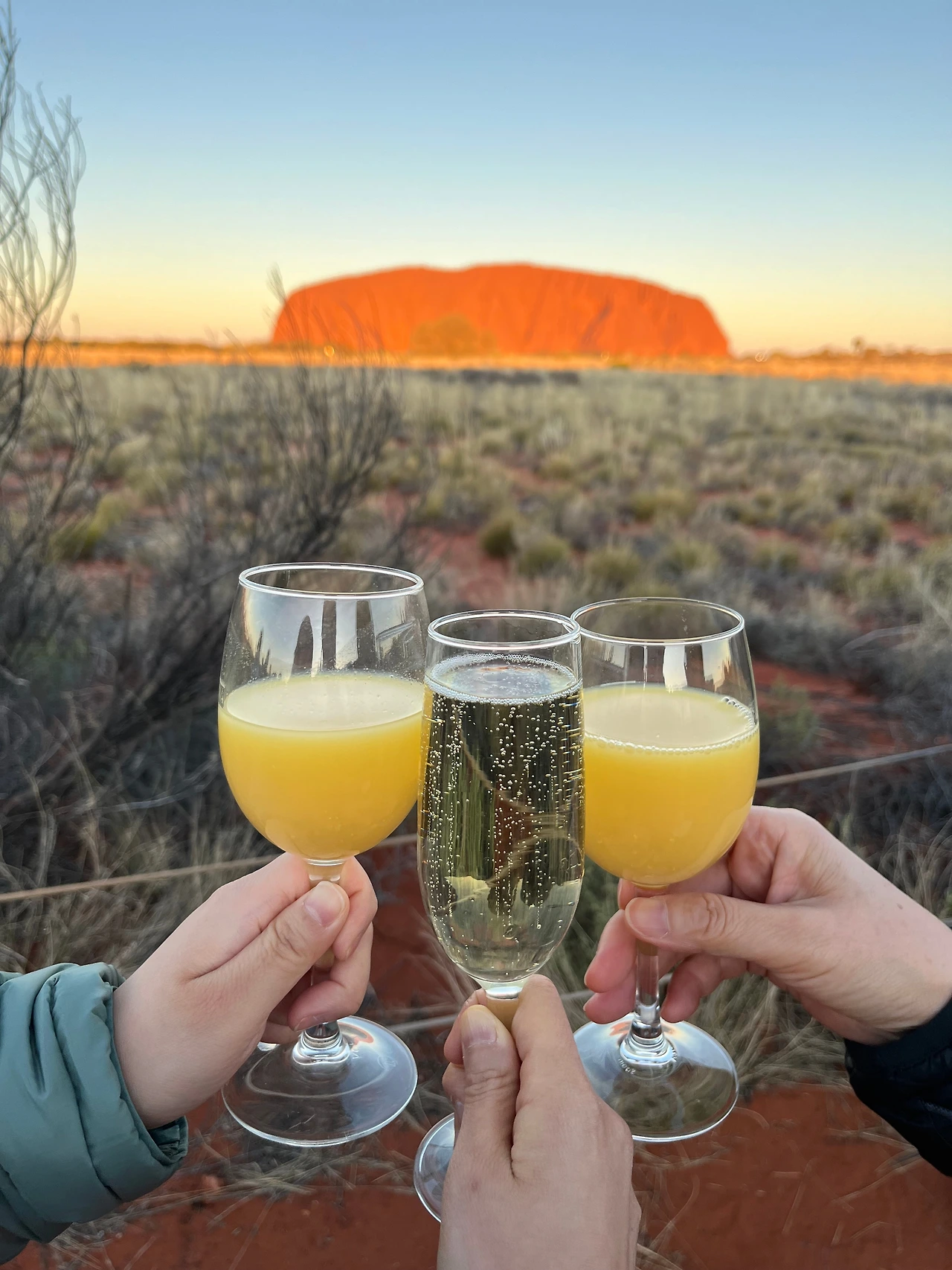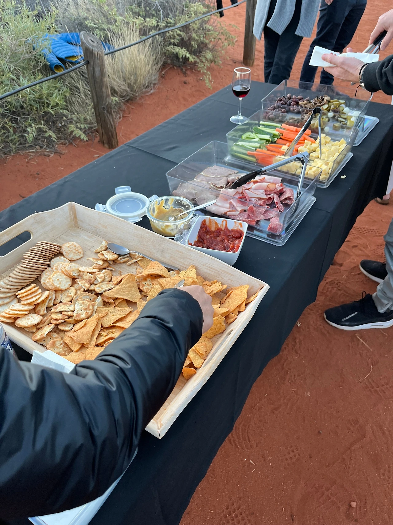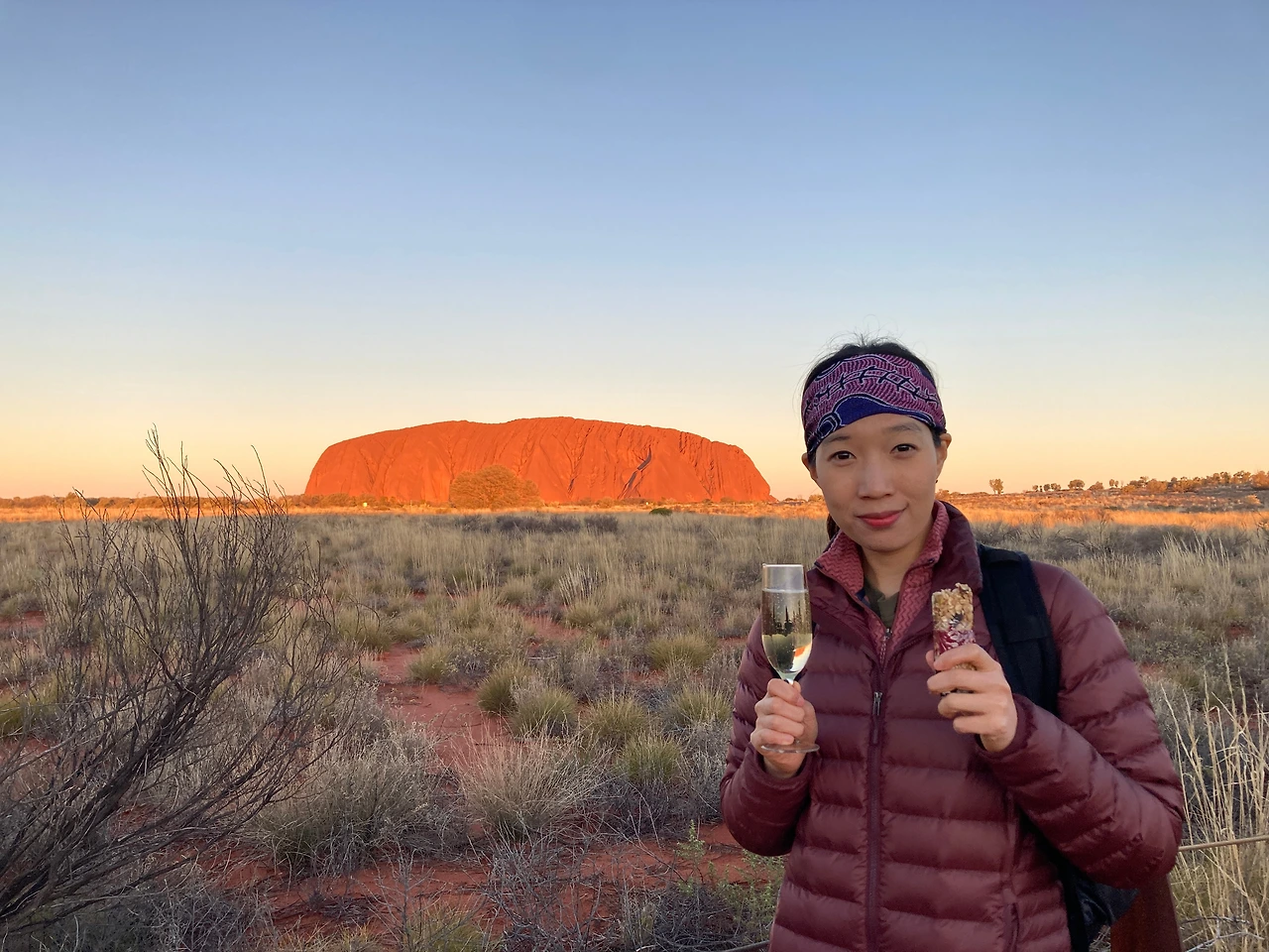 성지 투어가 후 버스를 타고 울루루 일몰 스팟으로 이동했다. 간단한 핑거푸드와 음료를 제공해 주는데, 조금 비위생적이어서 음료와 에너지바만 먹었다. 잠시 먹고 마시는 사이 해가 지기 시작하면서 울루루가 점점 붉어졌다. 정말 멋진 장면이었는데, 멋짐과는 별개로 굉장히 추웠다. 낮에만 해도 해가 쨍해서 패딩을 벗었다 입었다 했는데, 오후가 되니 기온이 뚝 떨어져 오들오들 떨었다. 사막 일교차의 위력을 체감하면 첫 투어를 마쳤다.