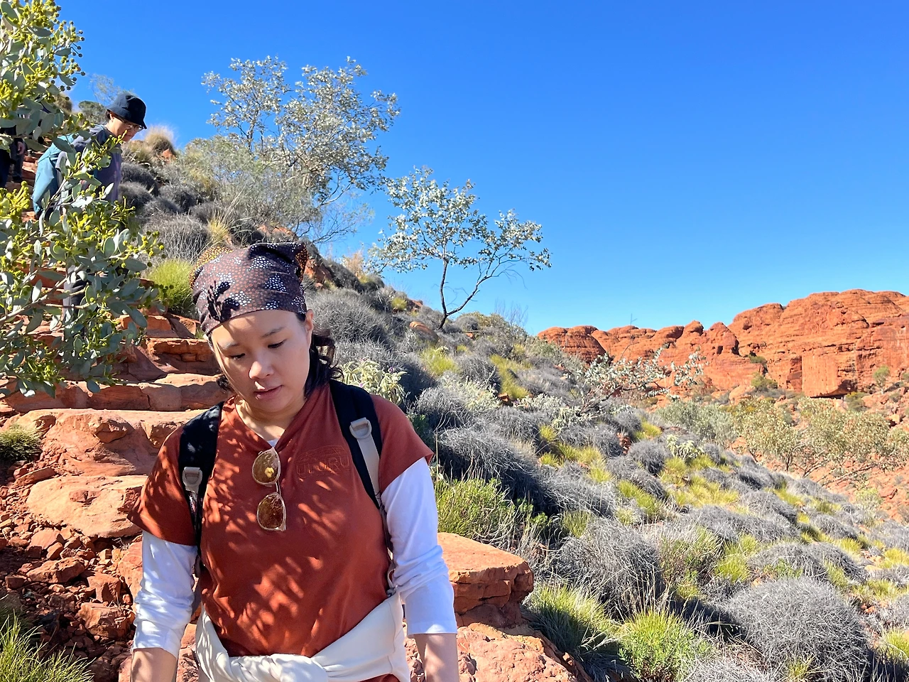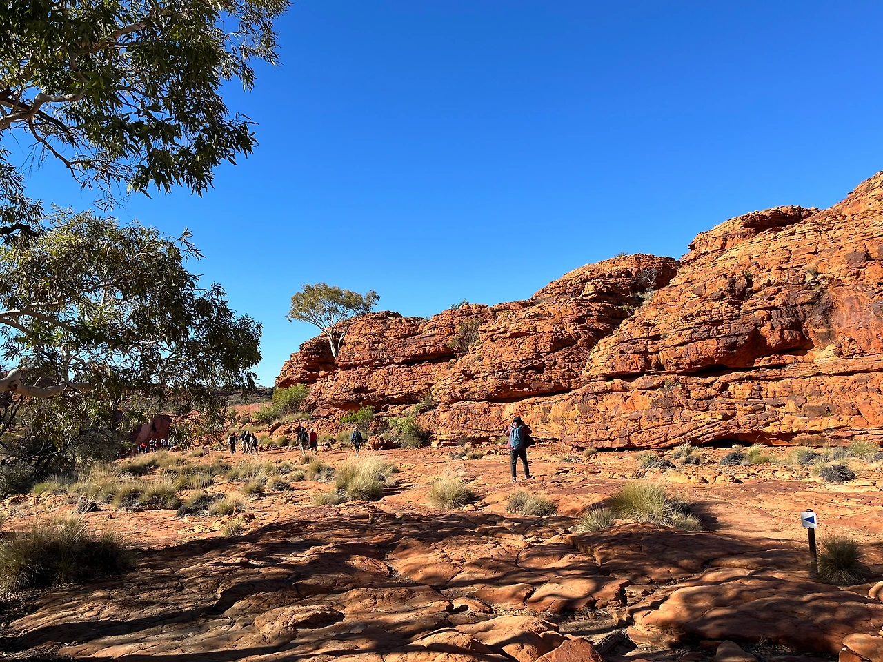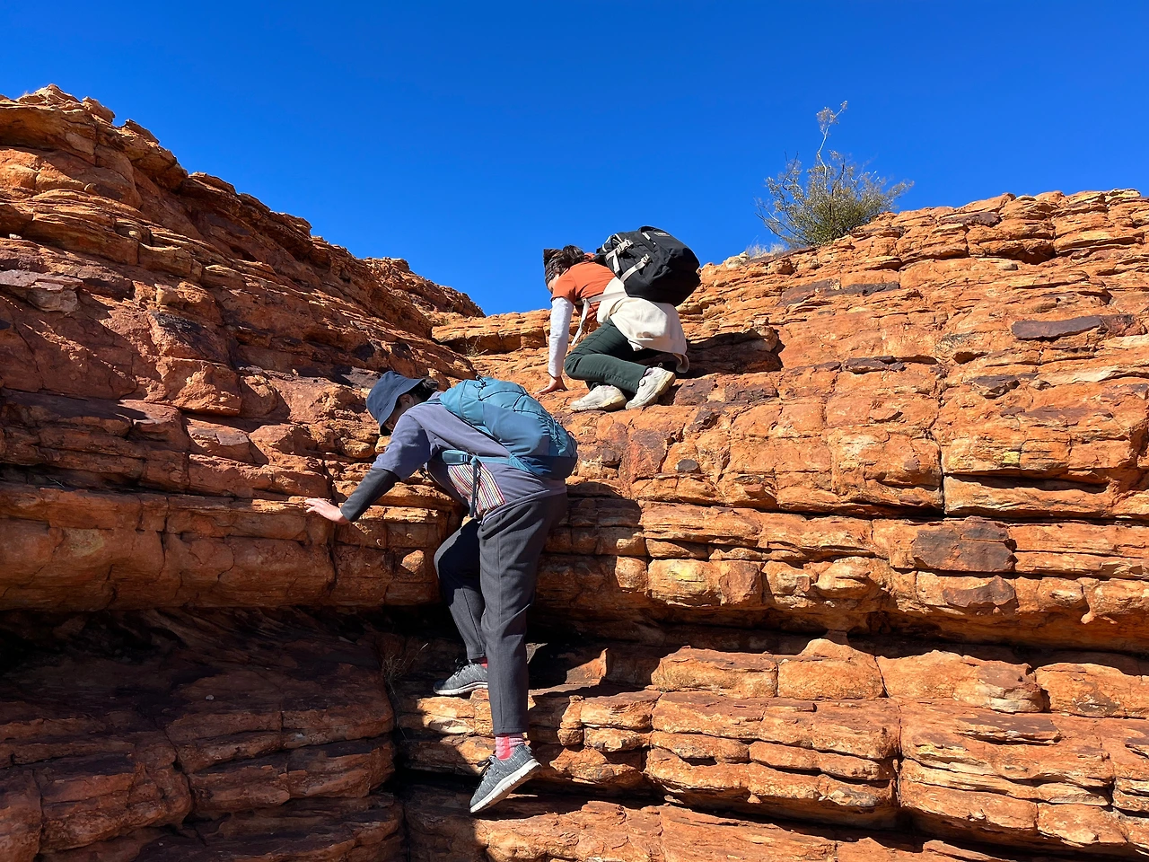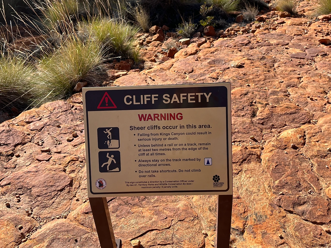 식사 후 버스로 와타르카(Watarrka National Park) 국립공원으로 이동했다. 이 날 투어는 킹스캐년의 협곡을 따라 약 6km 정도를 걷는 림워크 트레킹 코스였다. 트레킹 시작 전 버스에서 가이드님이 무서운 서약서를 받아가셨다. 안전 서약서인데 고온, 탈수, 낙상 등의 위험이 있음을 인지하고 전적으로 위험에 대한 책임은 나에게 있다는 내용이다. 겨울에는 상대적으로 위험이 덜한데, 여름에는 기온이 36도 이상까지 올라서 실제로 탈수나 열사병 사고가 발생한다고 한다. 그래서 여름에는 오전 11시 이후에는 등반이 금지되고, 물도 3리터 이상 지참해야만 등반을 시킨다고 한다. 겨울인데도 가이드님이 일일이 물이 있는지 확인을 하셨다.