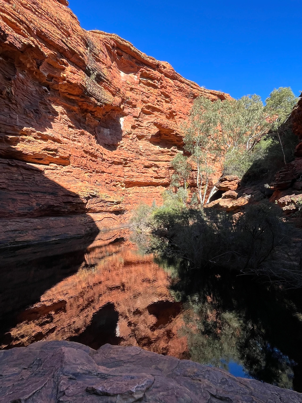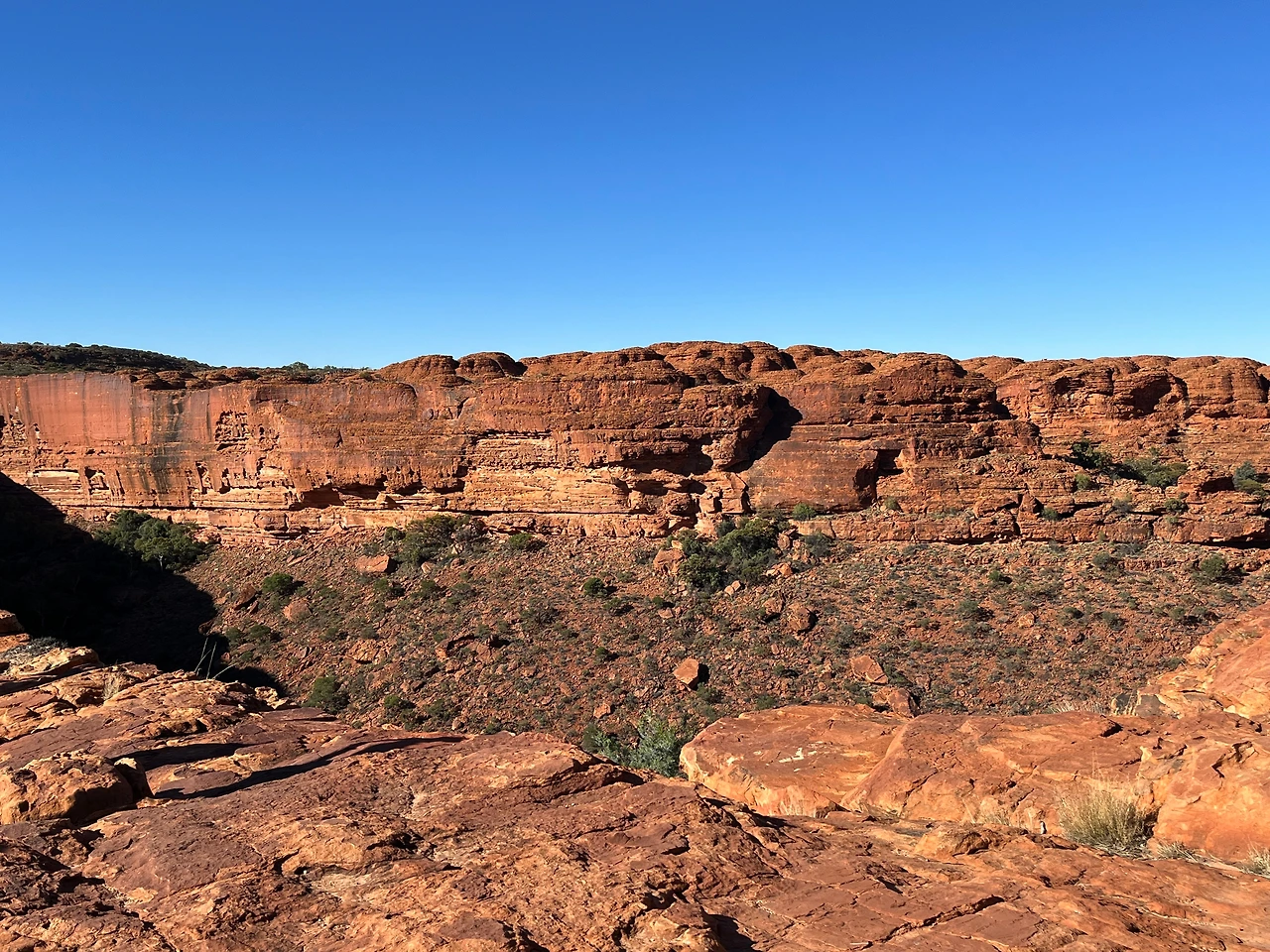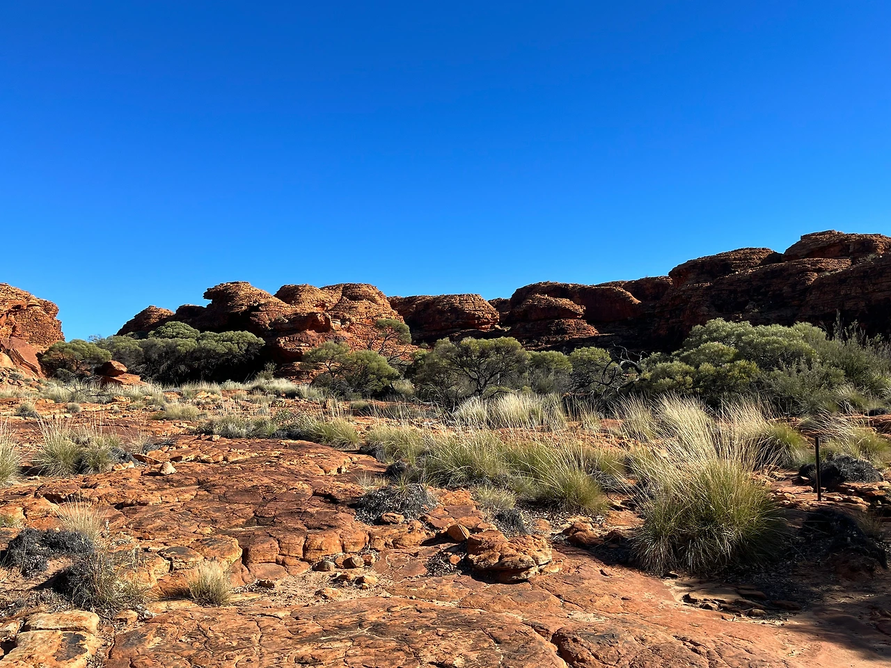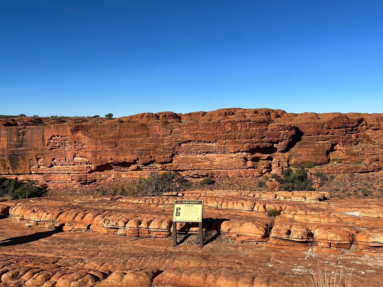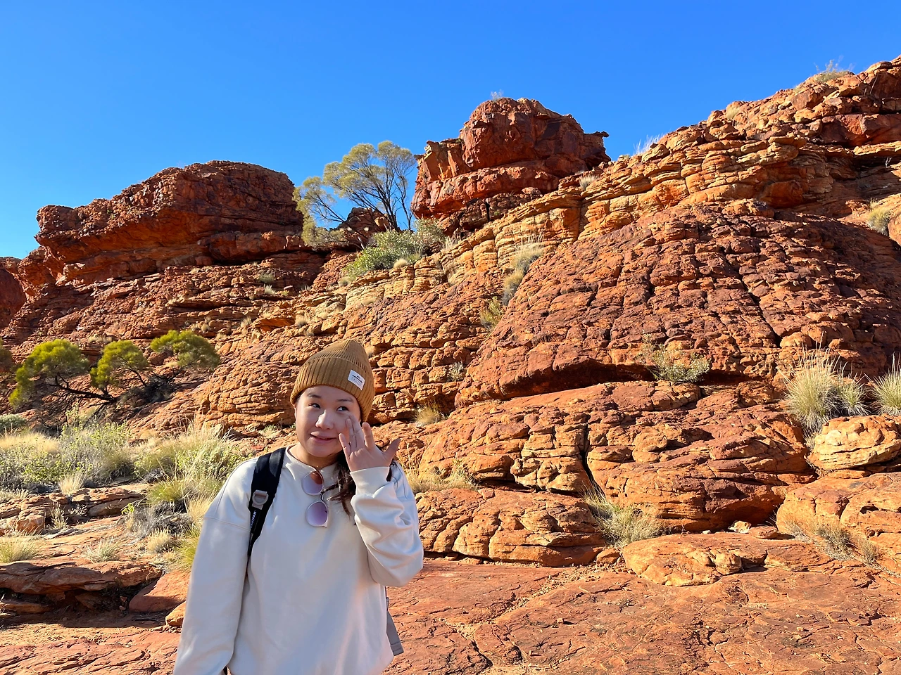 식사 후 버스로 와타르카(Watarrka National Park) 국립공원으로 이동했다. 이 날 투어는 킹스캐년의 협곡을 따라 약 6km 정도를 걷는 림워크 트레킹 코스였다. 트레킹 시작 전 버스에서 가이드님이 무서운 서약서를 받아가셨다. 안전 서약서인데 고온, 탈수, 낙상 등의 위험이 있음을 인지하고 전적으로 위험에 대한 책임은 나에게 있다는 내용이다. 겨울에는 상대적으로 위험이 덜한데, 여름에는 기온이 36도 이상까지 올라서 실제로 탈수나 열사병 사고가 발생한다고 한다. 그래서 여름에는 오전 11시 이후에는 등반이 금지되고, 물도 3리터 이상 지참해야만 등반을 시킨다고 한다. 겨울인데도 가이드님이 일일이 물이 있는지 확인을 하셨다.