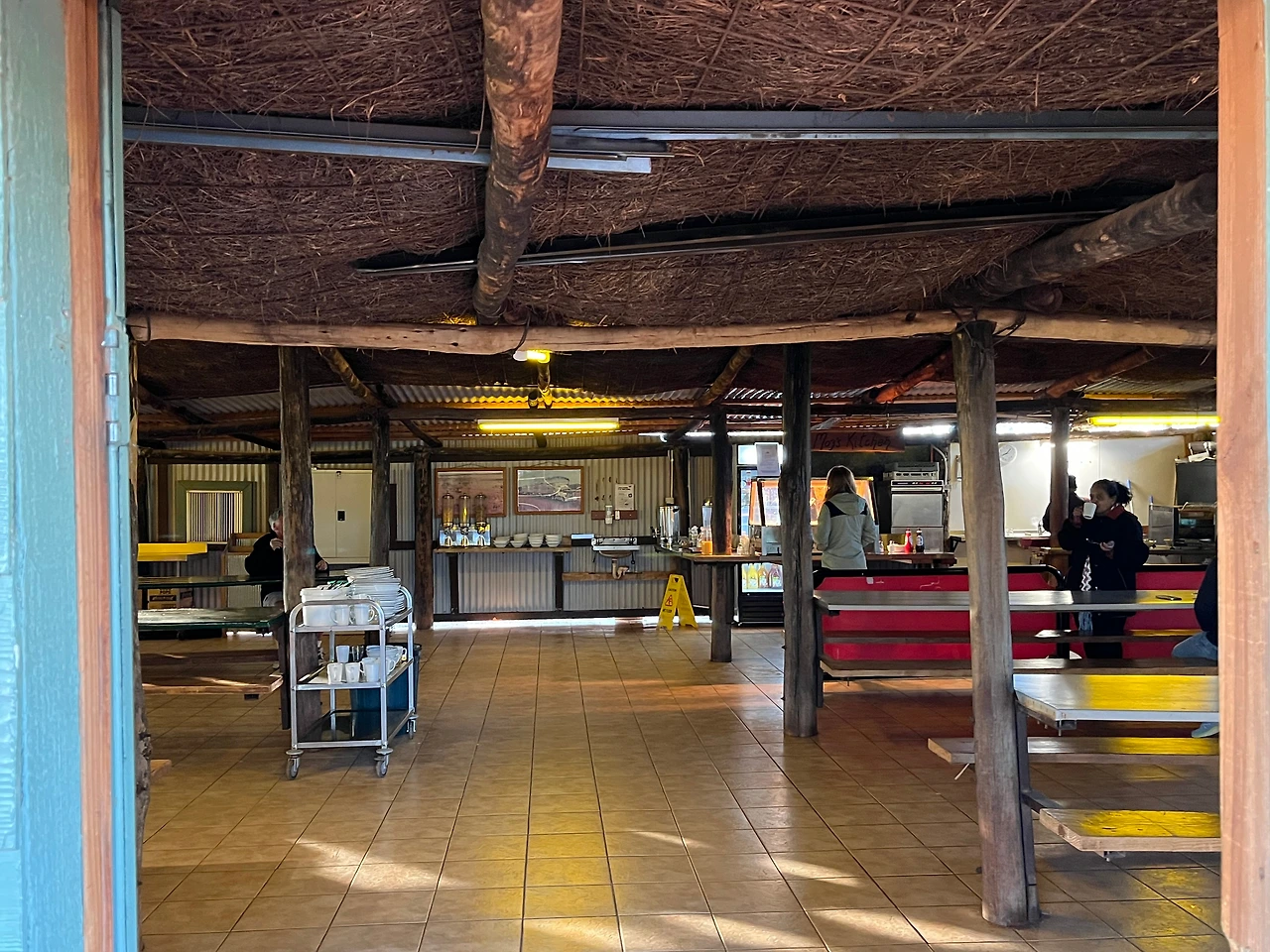 7시 반쯤 킹스캐년 근처의 작은 헛간(?)에서 아침식사를 했다. The old bough shed라는 이 헛간은 1983년에 지어진 곳인데, 예전이나 지금이나 아웃백에서 중요한 쉼터 역할을 하는 곳이다. 과거 유목민이었던 원주민들은 이동 중 바람이나 해를 피할 임시 거처를 나뭇가지와 풀로 만들었는데, 1900년대 초 이곳에 유입된 백인들이 원주민의 헛간을 참고해 더 큰 헛간을 지었다고 한다. 이곳 역시 그런 장소 중 하나다. 정말 뼛속까지 깃드는 추위 속에서 식사를 했다. 아침식사는 베이컨, 계란, 구운 야채, 토스트, 커피와 차가 제공됐는데, 너무 추워서 어떻게 먹었는지 잘 기억도 안 난다. 겨울 사막은 기온이 0도에서 20도를 왔다 갔다 하는데, 정말 적응이 안 되는 일교차였다.