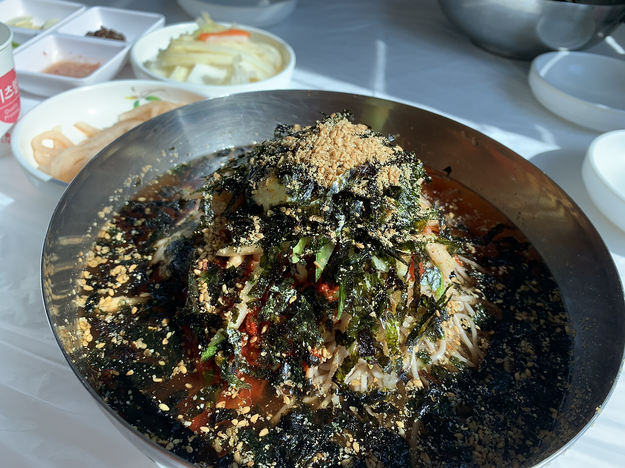 아침으로 두부를 먹은지 채 2시간이 되지 않았는데, 일찍 올라가야하는 일행 중 막국수 찐팬이 있어 또 먹으러 갔다. 사실 막국수는 내가 좋아하는 메뉴가 아니다. 특히 강원도 막국수는 빨간 양념을 베이스로 하고, 간혹 질긴 면이 있어 선호하지 않는다.(나의 최애 막국수는 고기리막국수다.) 그럼에도 강원도에 갈 때마다 막국수집을 들린다. 워낙 방대한 양의 막국수집이 있기에 나의 인생막국수 집을 찾겠다는 일념으로.. 범바위막국수는 평점이 굉장히 높은데(네이버 지도 기준 4.7), 실제로도 나쁘지 않은 집 중 하나였다. 그래서 그런지 점심시간이 한참 지난 2시쯤 도착했는데도 사람들이 꽉 차 있었다. 이 집에서 나의 원픽은 물막국수다. 면에서 메밀향이 좀 부족하긴 했지만, 물막국수가 시원했다. 아침이 채 소화되기도 전에 먹었는데 이 정도 맛있었으면, 훌륭한 맛 아닐까싶다. 명태비빔막국수와 수육도 같이 시켰는데 둘은 그냥 그랬다. 비빔막국수는 고춧가루 양념이 너무 쎄게 느껴졌고, 수육은 나에겐 좀 퍽퍽했다. 나는 비계가 좀 있는 수육을 선호한다. 다음에 근처를 지나게 되면 다시 들릴 것 같다.