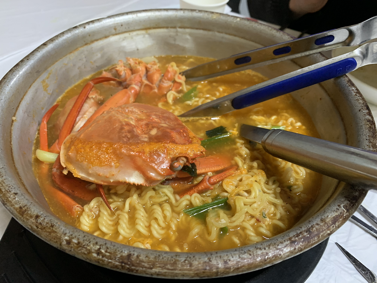 어민시장에 갈 때마다 이용하는 식당은 어민시장 근처 선화네(웅이네건어물)다. 어디서 게를 사든 사장님들이 여기를 추천해주셨다ㅎㅎ. 이곳은 테이블비는 한 테이블당 2만원, 게라면은 1인분에 4,000원, 게딱지밥은 1개 2,000원으로 매우 합리적이다. 두둑한 홍게 봉다리를 들고 홍게 먹으러 왔다고 하면 사장님이 바로 찜기에 쪄서 주신다. 맛이 없을 수가 없다. 그 날 잡은 게를 바로 쪄서 먹는데.. 이날은 특별히 소라도 한봉다리 샀다. 게가 나오면 사장님이 게살 잘 바르는 법 특강을 해주신다. 하지만.. 특강 듣는다고 다 만점 받지 않듯이 특강이 무색하게 게살 바르는건 늘 어렵다…ㅎㅎ 게딱지 밥과 홍게라면을 먹으려면 게 내장과 몸통을 남겨야 한다. 내장은 게 몸통을 게딱지에서 떼낼 때, 조심스레 분리하면 된다. 게라면을 먹으려면 몸통을 1-2개 정도 남겨야 한다. 작년 11월 여행에서 게 내장 남기는 설명을 동영상으로 남겨나 같이 올려본다. 반복학습이 중요하기에 게 다리 살 바르는 법을 남겼어야 했는데, 사장님 스킬에 감탄하다 놓치고 엉뚱한 걸 남겼다.. 홍게라면이 정말 풍미가 좋아서 대체 이게 무슨 라면인지를 놓고 토론이 벌어진 적이 있다. 신라면부터 사리면까지 안 나온 라면이 없는데, 모두 정답 비켜갔다. 정답은 의외로 1차원적이었고, 또 납득이 가는 라면이었다. 바로 해물라면ㅎㅎ 다음에 집에서 킹크랩 삶을 때, 해물라면을 이용해야겠다.
