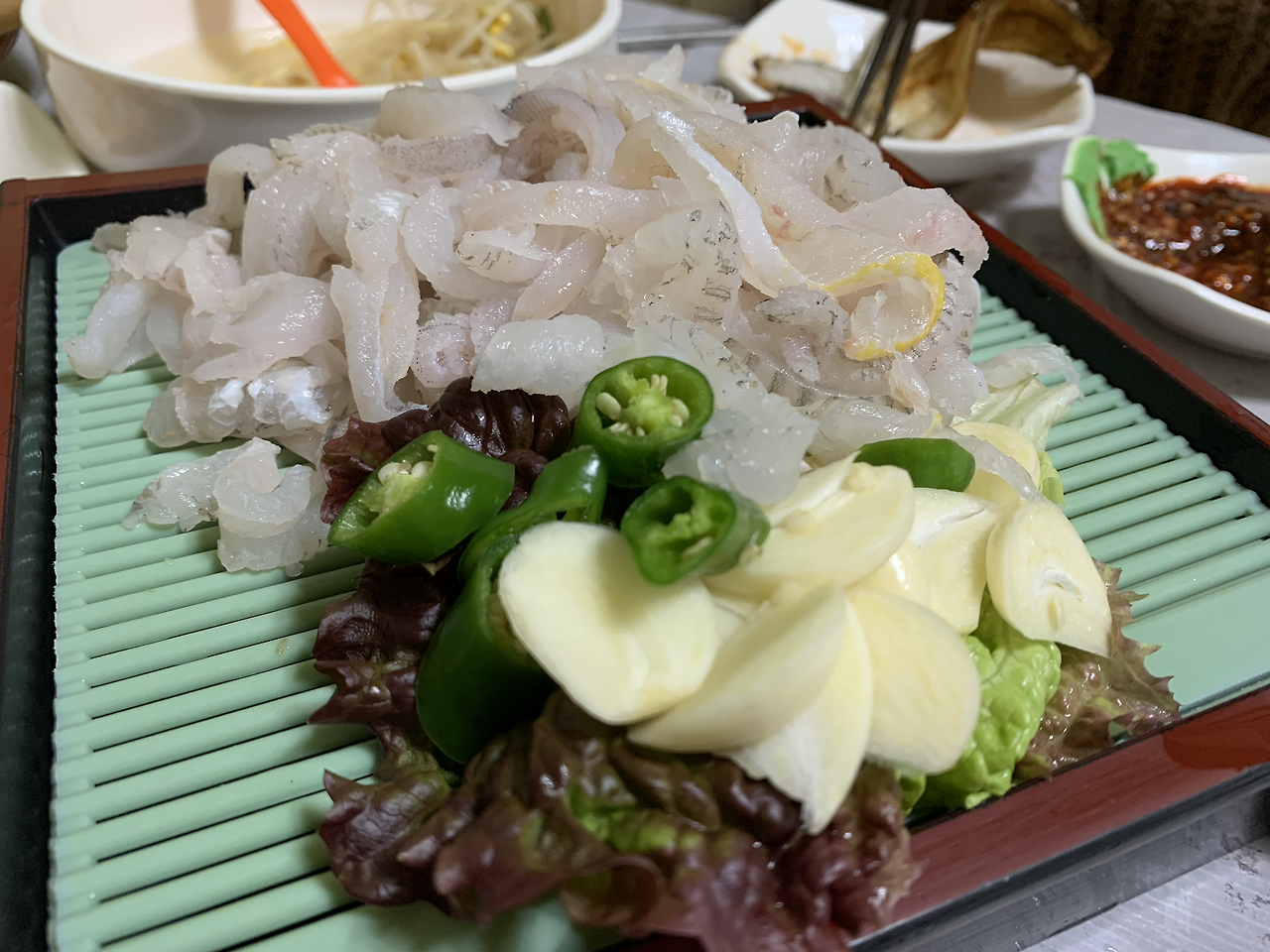 이집은 참가자미 세꼬시가 유명한데, 이 외에도 그 때 그 때 잡는 고기가 달라 매일 메뉴가 조금씩 바뀐다. 식당 한 구석 칠판에 써 있는 오늘의 생선을 참고하면 좋다. 가자미회와 도루묵 구이를 먹고 싶었는데, 도루묵은 철이 지나 먹지 못했다. 한참 추울 때 와야 도루묵을 먹을 수 있다고 한다. 다음 겨울을 기약하며 가자미 세꼬시 중자와 가자미 튀김을 시켰다. 세꼬시를 정말 잘 잡아주셔서 가시하나 안 걸리고, 고소했다. 특히 사장님의 특제소스를 곁들여 먹으면 세꼬시에 감칠맛이 더해진다. 가자미 튀김은 통으로 튀겨져 나오는데, 정말 예상보다 훨씬 맛있었다. 구이와는 또 다른 풍미와 고소함이 있다. 가자미 통구이는 잔가시는 바르지 않고 꼭꼭 씹어먹으면 더 맛있다.
