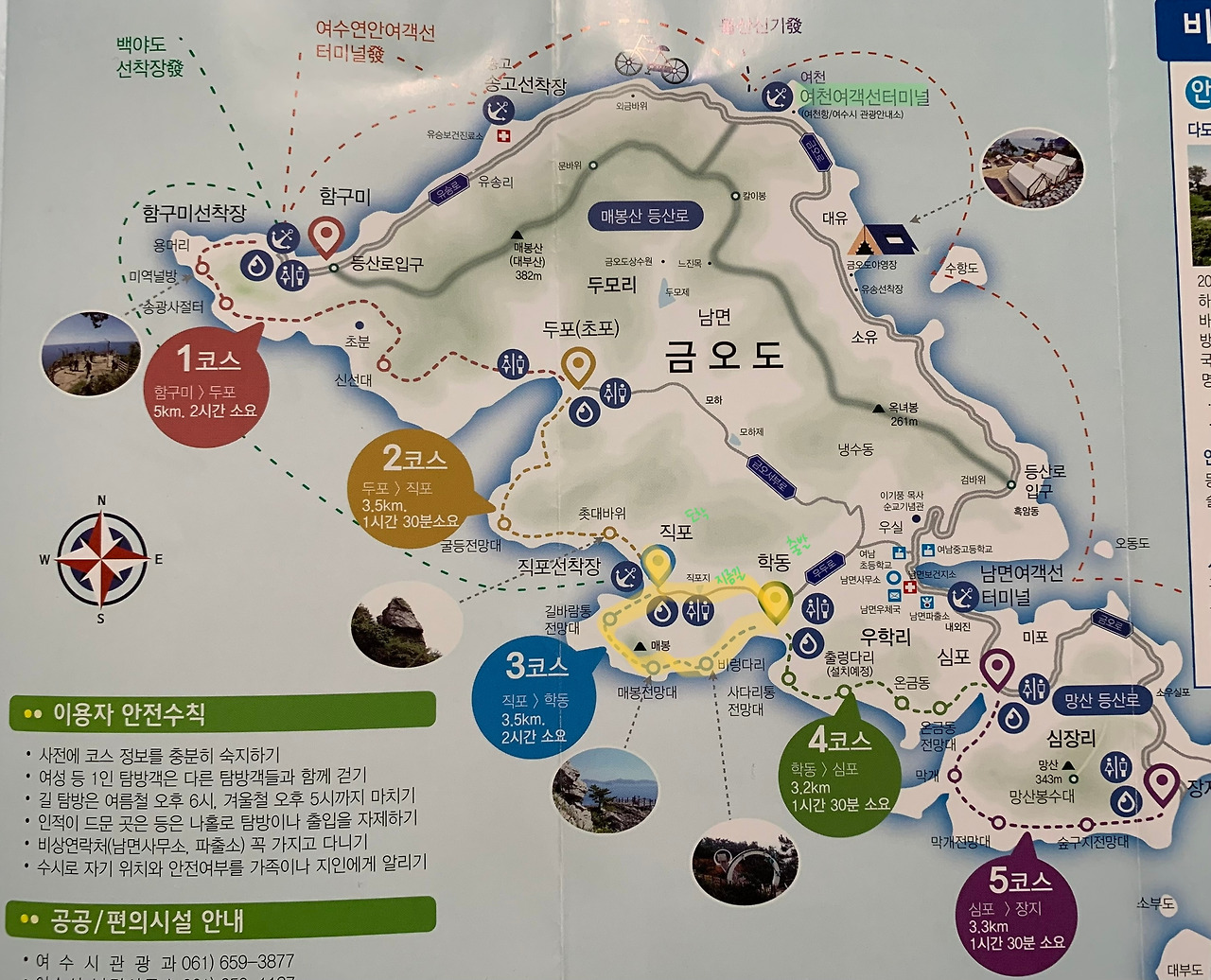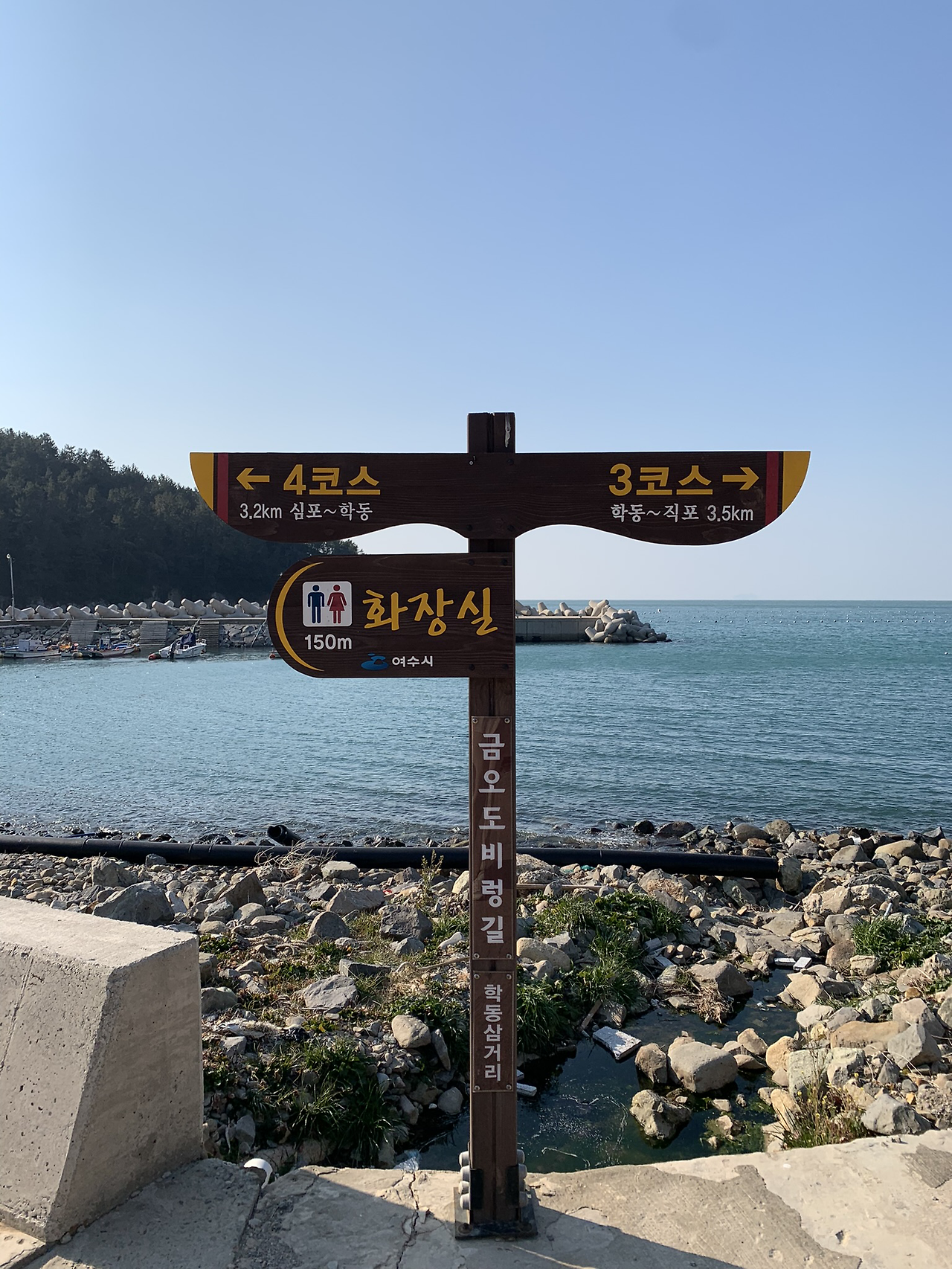 이번 여수 여행의 목표라고 할 수 있었던 금오도. 금오도까지 가는 배편은 3가지 정도 되는데, 우리는 배타는 시간을 최소화하고 싶어 여수 시내에서도 차를 타고 한시간 정도 되는 돌산신기항으로 갔다. 향일암 가는 방면이다. 여행 몇 주전부터 금오도 트래킹을 고대했음에도 며칠 째 지속된 여행과 전날 예상치 못하게 새벽까지 떤 수다에 아침 일찍 일어나서까지도 갈까 말까 고민을 했는데, 결론적으로 정말 잘 다녀왔다. 몸은 피곤했지만 후회는 없다.