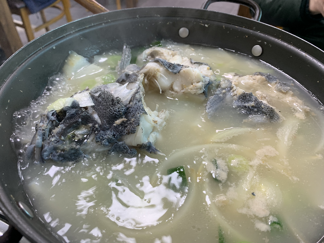 원래는 미포 쪽으로 가서 점심을 먹을 계획이었는데, 배고픔과 추위로 직포에 도착하자마자 눈 앞에 있는 식당으로 직행했다. 뭐 찾았다 한들 근처에는 식당은 하나뿐이라 다른 선택지도 없었다. 이름은 삼코스식당(굉장히 일차원적인 이름이다) 멋 모르는 외지인인 우리는 메뉴판을 열심히 정독 후 시켰는데, 이후 들어온 주민분들이 주문하시는 것을 보니 메뉴에 없는 메뉴들만 시키셨다. 어쨌든 우리는 뜨끈한 국물이 필요했기에 우럭지리를 시켰다. 탕을 시키자마자 생우럭을 잡으시길래 급 광분해서 메뉴판에서 서대회무침을 추가했는데 그게 잘못이었다.. 시키는 순간 사장님이 냉동실에서 무엇을 꺼내셨는데 그게 내 서대회일 줄이야.. 원래도 빨간양념 들어간 음식을 싫어하는데 냉동 회무침이라니…