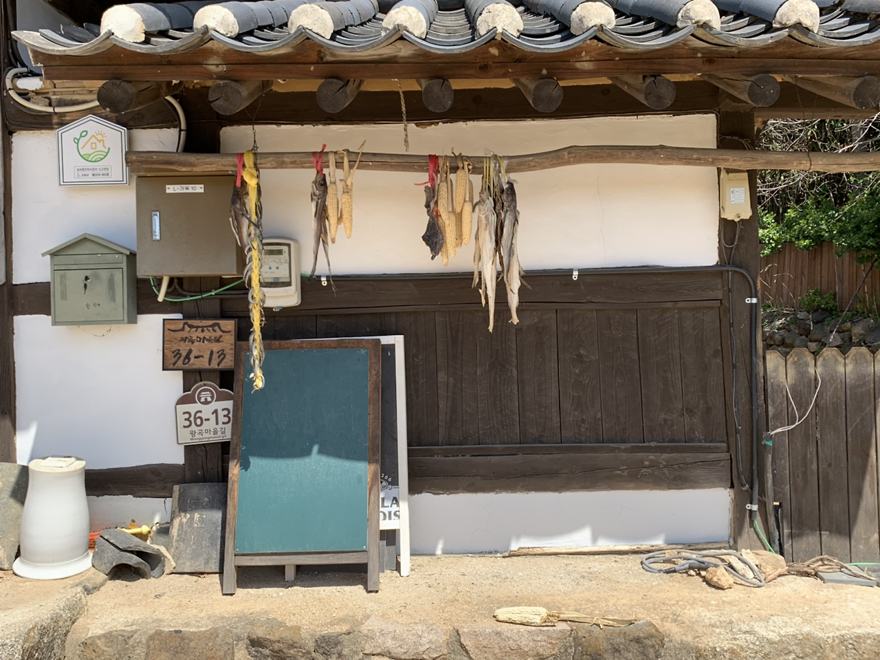 벚꽃을 보러 간 여행이었는데, 목련꽃을 더 많이 만났다. 마을 안에는 집집마다 목련나무가 심어져 있었는데, 만개하여 한옥풍경이 더욱 운치 있었다. 마을은 실제로 주민들이 생활하는 곳으로, 구경하다 보면 곳곳에 정겨운 생활의 흔적들을 마주하게 된다. 아래 사진은 북어?를 말리는 모습이다. 이 외에도 집에서 직접 기른 닭이 낳은 계란이나 각종 농산물을 파는 집도 있고, 민박을 운영하는 집들도 있다. 마을 구경 중 ‘청란 팔아요’라는 집 앞 팻말을 보게 되었다. 청란은 마트에서는 구하기 힘들어서 가끔 시골장에서 마주치면 사 오곤 하는데, 몇 알이라도 사가고 싶어 사장님께 전화를 드렸는데, 며칠 전 아드님이 오셔서 유정란이고 청란이고 다 가져가셨다고 하여 못 샀다..ㅎㅎ