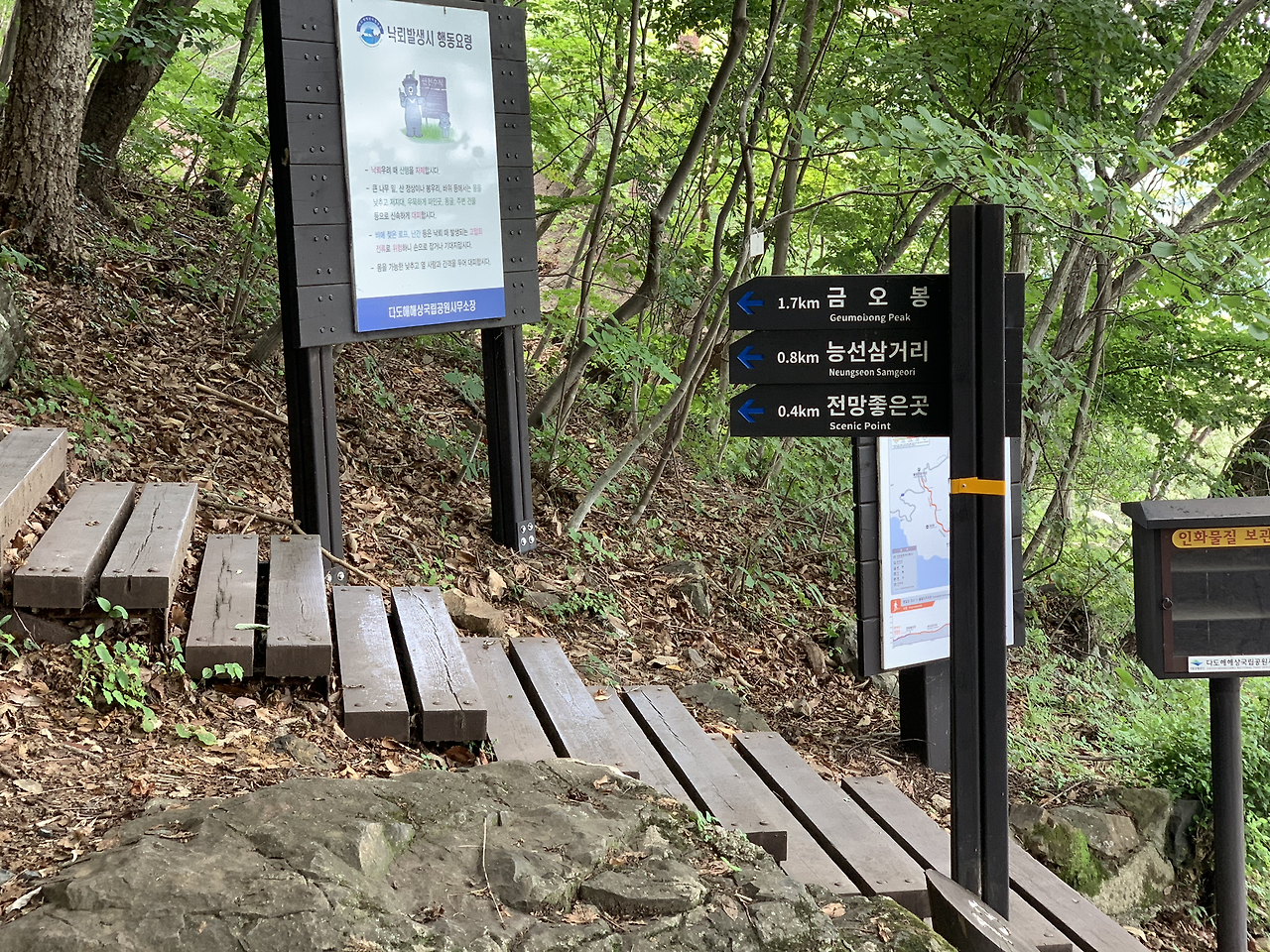 관음전에서 다시 내려올 때는 평지길을 이용했다. 일주문부터 관음전까지 사진도 찍고 풍경도 보며 여유 있게 걸었는데, 왕복 40분이 좀 넘게 걸린 것 같다. 처음 향일암에 왔을 때는 꽤 걸었던 것 같은데, 두 번째 방문이라 그런 건지 아님 요즘 한창 운동을 많이 해서 체력이 좋아진 건지 생각보다 시간이 적게 걸렸다. 평지길로 내려오다 보니 옆 사잇길로 트래킹 코스 안내판이 보였다. 게다가 ‘전망 좋은 곳’이라니.. 안 갈 수가 없지 않은가. 짧은 트래킹이 좀 아쉽기도 하여 자연스럽게 계단을 오르기 시작했다.