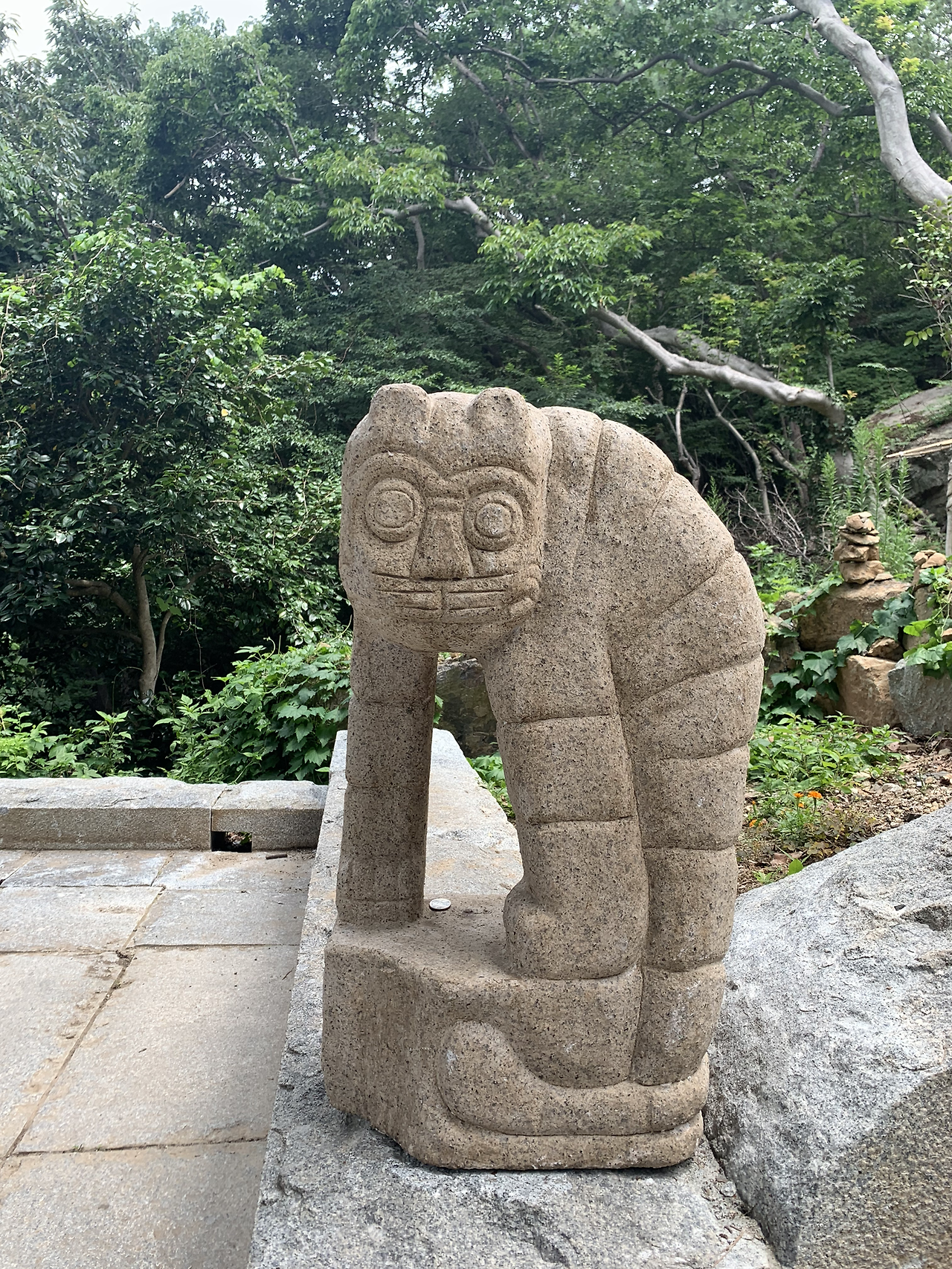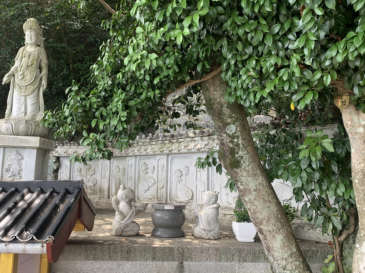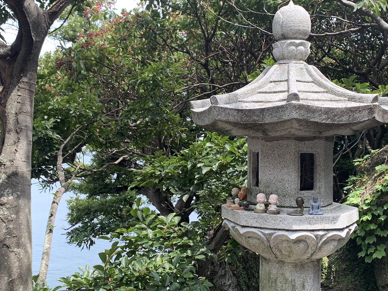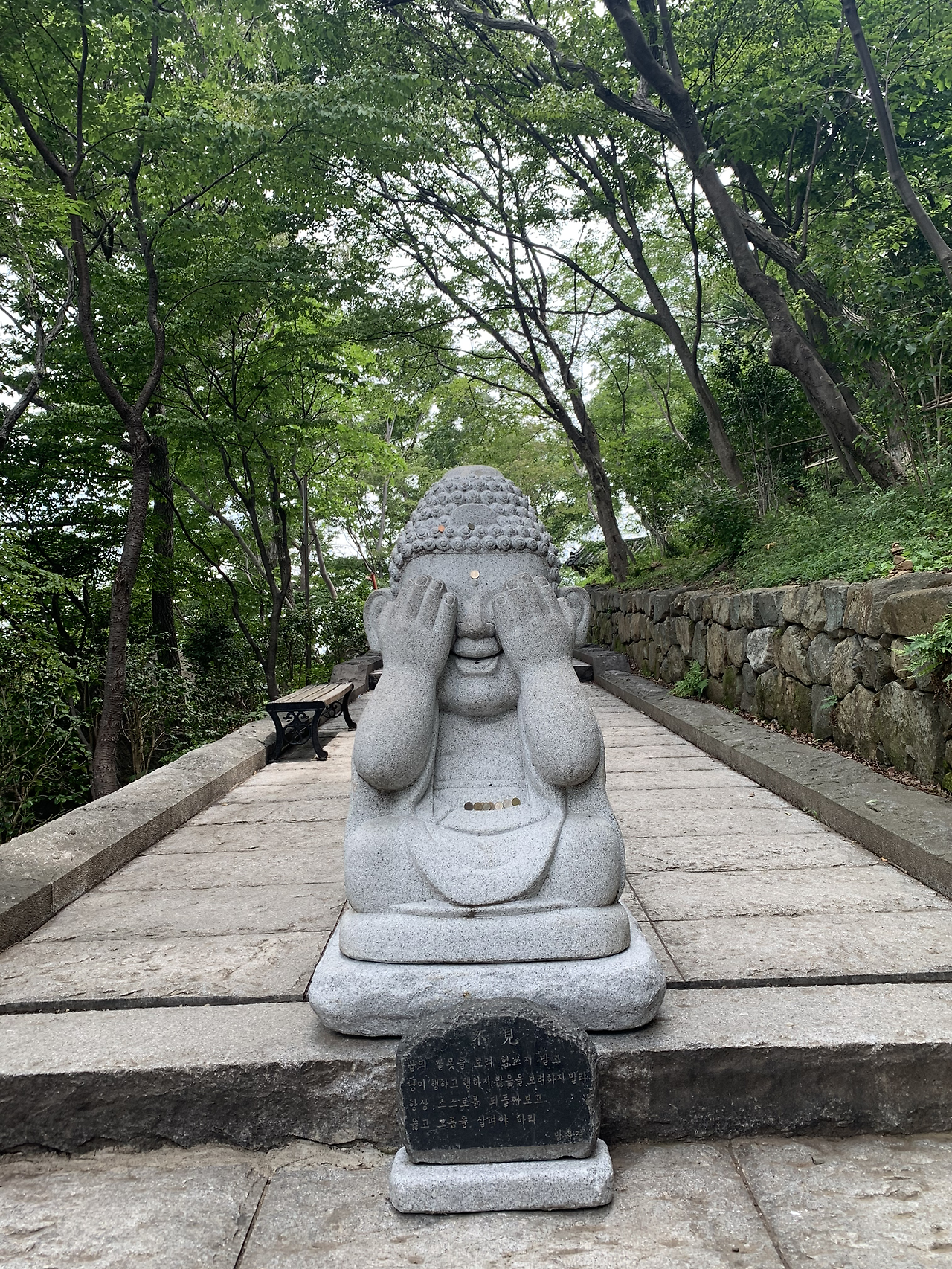 여수에서 트래킹 코스를 고민하다가 향일암으로 향했다. 작년 봄 여수 여행 때, 높은 암자 위에서 바라본 바다 풍경이 너무 멋있었던 기억이 있어 재방문했다. 향일암은 트래킹 코스로는 좀 짧은데, 경사가 꽤 가팔라 운동이 된다. 향일암까지 가는 길에는 계단길과 평지길이 있는데, 올라갈 때는 일주문을 통과하는 계단길로 갔다. 계단을 오르다 보면 귀여운 불상들이 반갑게 맞이해준다. 불교 신자가 아니어서 불상을 참 귀엽게 만들었다고만 생각했는데, 불언, 불문, 불견이란 불상으로 다 깊은 뜻이 있는 조각상들이었다. 나쁜 말을 하지 말라는 불언, 비난과 칭찬에도 평정심을 유지하라는 불문, 남의 잘못을 보지 말고 스스로를 보라는 불견. 일주문을 지나 한참 계단을 열심히 오르다 보니 바다가 한눈에 들어오는 전망대가 나온다. 전망대 옆에 조그마한 카페도 있었는데 내려와 시원한 아아를 먹는 걸 기약하며 다시 올랐다.