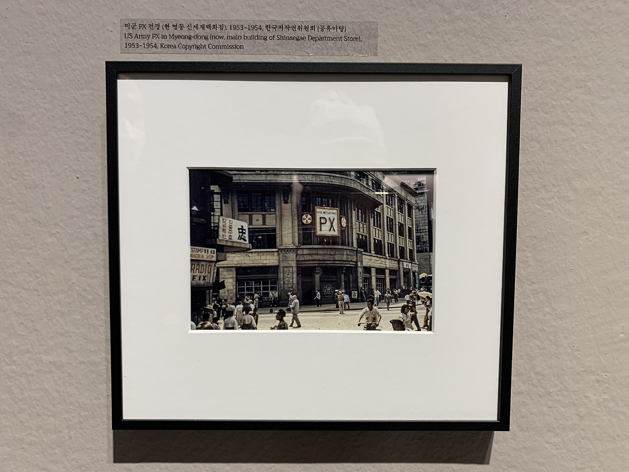 박수근 전시와 함께 한영수 사진작가가(1933-1999) 라이카 카메라로 전쟁 직후의 서울의 모습을 담은 사진들 또한 전시중이었다. 아래 사진은 그 당시 미군부대로 활용되던 곳인데, 현재는 신세계백화점 본관 건물이다. 작년 겨울 미디어 파사드로 인기몰이를 한 백화점 건물이 당시 미군 PX였다니..ㅎㅎ 신기해서 한 장 담아봤다.